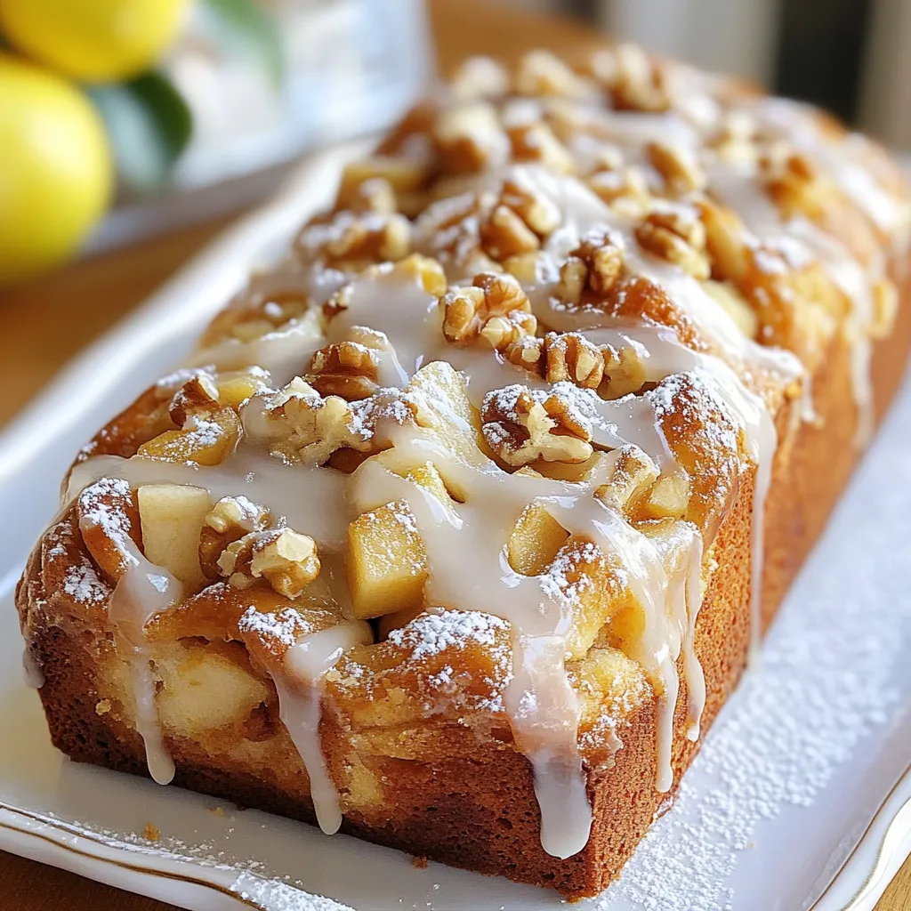 A deliciously moist bread filled with apples and topped with a sweet glaze.