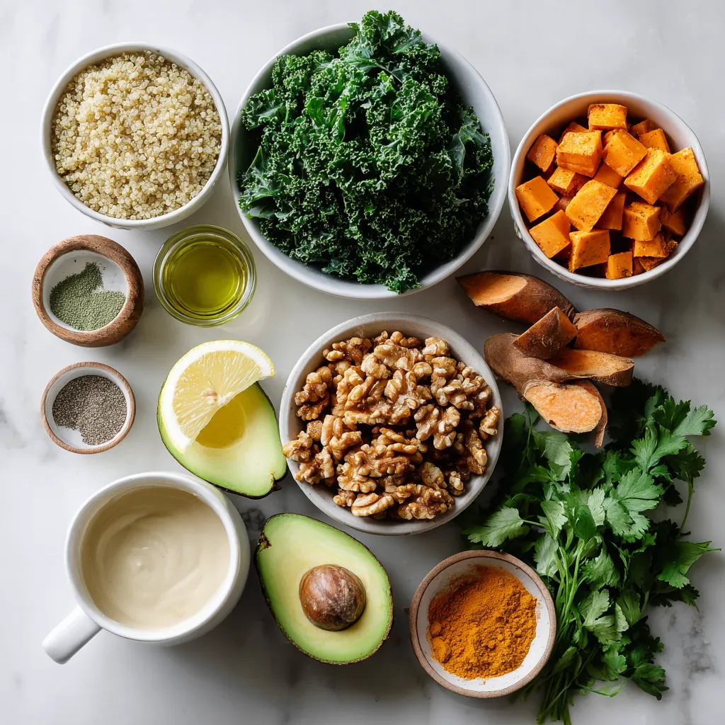 Each ingredient in this bowl offers great health perks. Quinoa is high in protein and fiber. It helps with digestion and keeps you full. Kale is packed with vitamins A, C, and K. It supports your immune system and skin health. Sweet potatoes are rich in beta-carotene. They boost your vision and skin health. Chickpeas add protein and fiber. They help in weight management and heart health. Walnuts are good for your brain. They provide healthy fats.