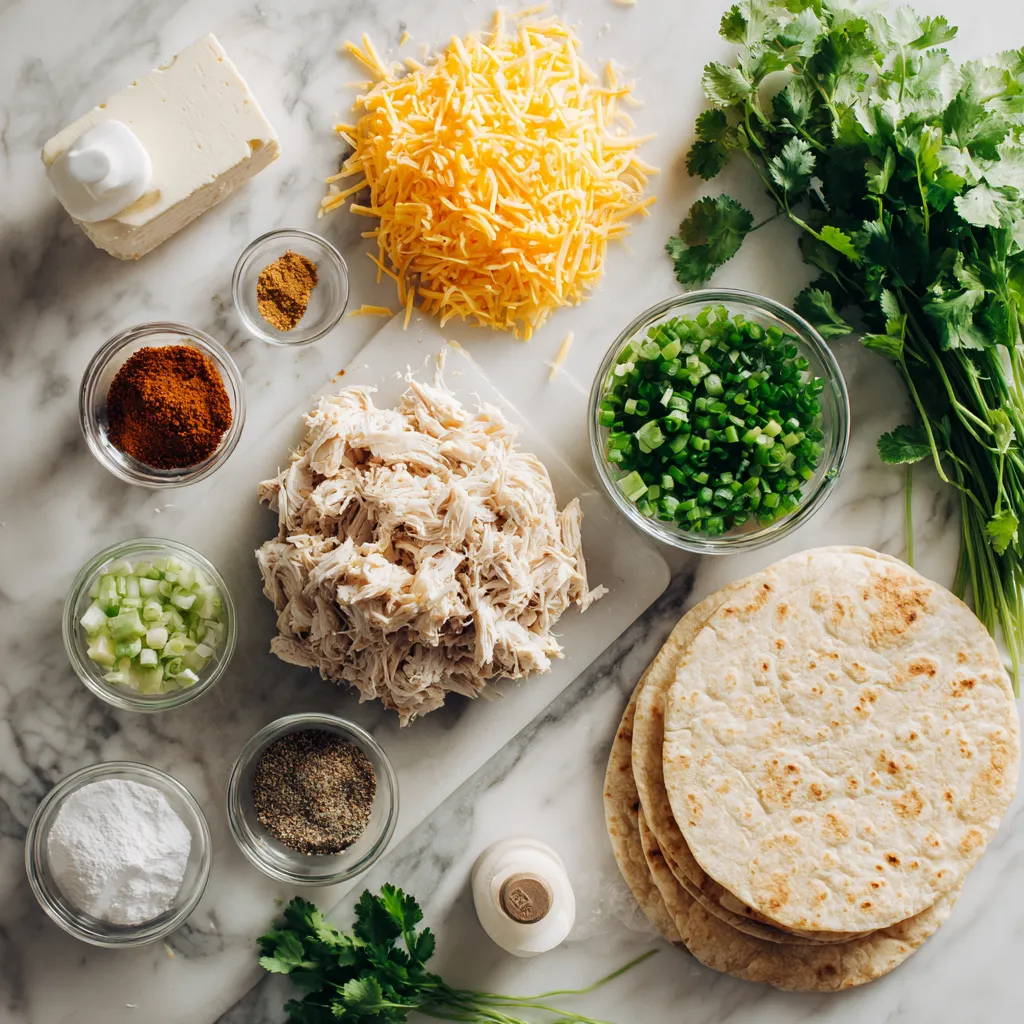In a mixing bowl, combine the shredded chicken, softened cream cheese, cheddar cheese, diced green onions, garlic powder, cumin, chili powder, salt, and pepper. Mix until well combined.