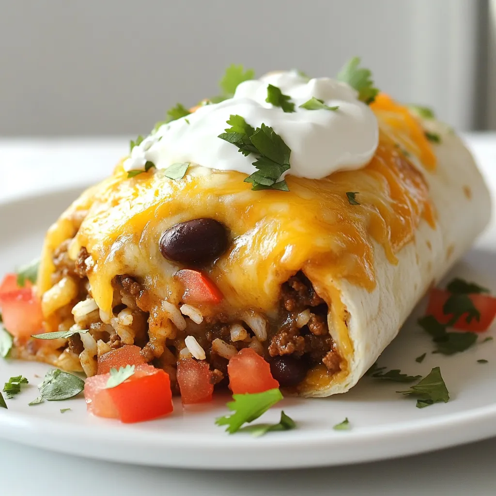 - 1 lb ground beef - 1 cup cooked white rice - 1 cup black beans, drained and rinsed - 1 cup shredded cheddar cheese - 1/2 cup sour cream - 1/4 cup taco sauce - 1 tablespoon taco seasoning - 4 large flour tortillas - 1/2 cup diced tomatoes - 1/4 cup chopped cilantro - Salt and pepper to taste The ingredients for the Beefy Melt Burrito come together with ease. First, you need ground beef. This is the base of the flavor. Add some cooked white rice to give it a nice texture. Black beans are next. They bring protein and fiber. Don’t forget the shredded cheddar cheese. It melts beautifully and adds richness. Next, you’ll want to grab sour cream. It adds creaminess and a cool contrast. Taco sauce brings a kick, while taco seasoning ties the whole dish together. Four large flour tortillas are essential. They wrap all the goodness inside. For garnishes, diced tomatoes add freshness. Chopped cilantro boosts the flavor. Lastly, salt and pepper are key to tasting your filling. With these ingredients, you can create a tasty comfort dish that feels like a warm hug. {{ingredient_image_1}} - First, heat a large skillet over medium heat. - Add 1 pound of ground beef to the skillet. - Cook until the beef is brown, about 5-7 minutes. - As it cooks, break the beef into small crumbles. - If there's extra fat, drain it off. - Next, stir in 1 tablespoon of taco seasoning, salt, and pepper to taste. - Add 1 cup of black beans and 1 cup of cooked white rice. - Mix everything well and cook for another 2-3 minutes. - Remove the skillet from heat. - Stir in 1/4 cup of taco sauce and half of the shredded cheddar cheese. - Take a large flour tortilla and lay it flat on a clean surface. - Spoon a generous portion of the beef mixture into the center of the tortilla. - Top the beef with 1/2 cup of sour cream and 1/2 cup of diced tomatoes. - Sprinkle the remaining cheddar cheese on top. - Fold the sides of the tortilla over the filling. - Roll it from the bottom up, keeping the filling secure. - Repeat this with the other tortillas and the remaining filling. - Preheat your oven to 375°F (190°C). - Place the rolled burritos on a baking sheet. - Sprinkle any leftover cheese on top of the burritos. - Bake for about 10 minutes, or until the cheese is melted and bubbly. - Once done, take them out and let them cool slightly. - Garnish with chopped cilantro for a fresh touch. - Choosing the right lean-to-fat ratio: I recommend using ground beef with a 80/20 ratio. This mix offers a good balance of flavor and moisture. Too lean, and your beef can turn dry. Too fatty, and it becomes greasy. - Flavor enhancements with spices: Enhance your beef with taco seasoning. This adds warmth and depth. You can also add garlic powder, onion powder, or even a pinch of cumin for extra flavor. - Ensuring no filling spills out: Start by placing the filling in the center. Don't overfill, or it will spill. Fold the sides over the filling first, then roll from the bottom up. This method keeps everything inside. - How to achieve a tight roll: After folding the sides, roll tightly. You want to keep it compact. This helps it hold together during baking and eating. - Oven technique adjustments: To get that perfect melt, preheat your oven to 375°F (190°C). Bake for about 10 minutes until the cheese is bubbly. If you want it extra crispy, broil for the last two minutes. - Alternative cheese options for flavor: While cheddar is classic, try pepper jack for some heat. Monterey Jack or a cheese blend can also add creaminess and flavor. Mix and match for your favorite taste! Pro Tips Use Lean Ground Beef: Opt for 80/20 or leaner ground beef to reduce excess fat and calories. This ensures a healthier burrito without sacrificing flavor. Customize Your Fillings: Feel free to add extra veggies like bell peppers or corn for added nutrition and flavor. You can also swap black beans for pinto beans if preferred. Perfectly Folded Burritos: To avoid spills, make sure not to overfill the tortillas. Folding the sides in first before rolling helps secure the filling inside. Make-Ahead Option: Prepare the beef mixture in advance and refrigerate it. You can assemble and bake the burritos later for a quick meal option. {{image_2}} For a tasty vegetarian twist, swap out the beef. You can use plant-based protein like lentils or crumbled tofu. These options still give a hearty feel. Add more veggies, too! Bell peppers, onions, or zucchini work well. Just sauté them before mixing with your protein. This adds color and crunch. Want some heat? Add jalapeños or a splash of hot sauce to the beef mixture. This will kick up the flavor. Consider using pepper jack cheese instead of cheddar. It melts beautifully and brings a nice zing. Sauces can change the whole dish! Try different taco sauces for a new flavor. You can also drizzle salsa or guacamole on top. This adds freshness and creaminess. Don’t be afraid to get creative with your sauces. Each option offers a unique taste that makes the burrito your own. To keep your Beefy Melt Burrito fresh, store leftovers in an airtight container. This helps lock in flavor and moisture. The recommended shelf life is about three to four days in the fridge. After that, the taste may change, and the quality might drop. When you're ready to enjoy your burritos again, the best methods for reheating are the oven or a skillet. Using an oven ensures even heat and a crispy exterior. Set your oven to 350°F (175°C) and heat for about 10-15 minutes. If using a skillet, heat it over medium heat. Cook each burrito for about 5 minutes on each side. This method helps avoid sogginess and keeps the burrito nice and warm. If you want to save some burritos for later, freezing is a great option. Wrap each burrito tightly in plastic wrap, then in aluminum foil. This will prevent freezer burn. You can store them for up to three months. To reheat frozen burritos, remove the foil and plastic wrap. Place them on a baking sheet and bake at 350°F (175°C) f