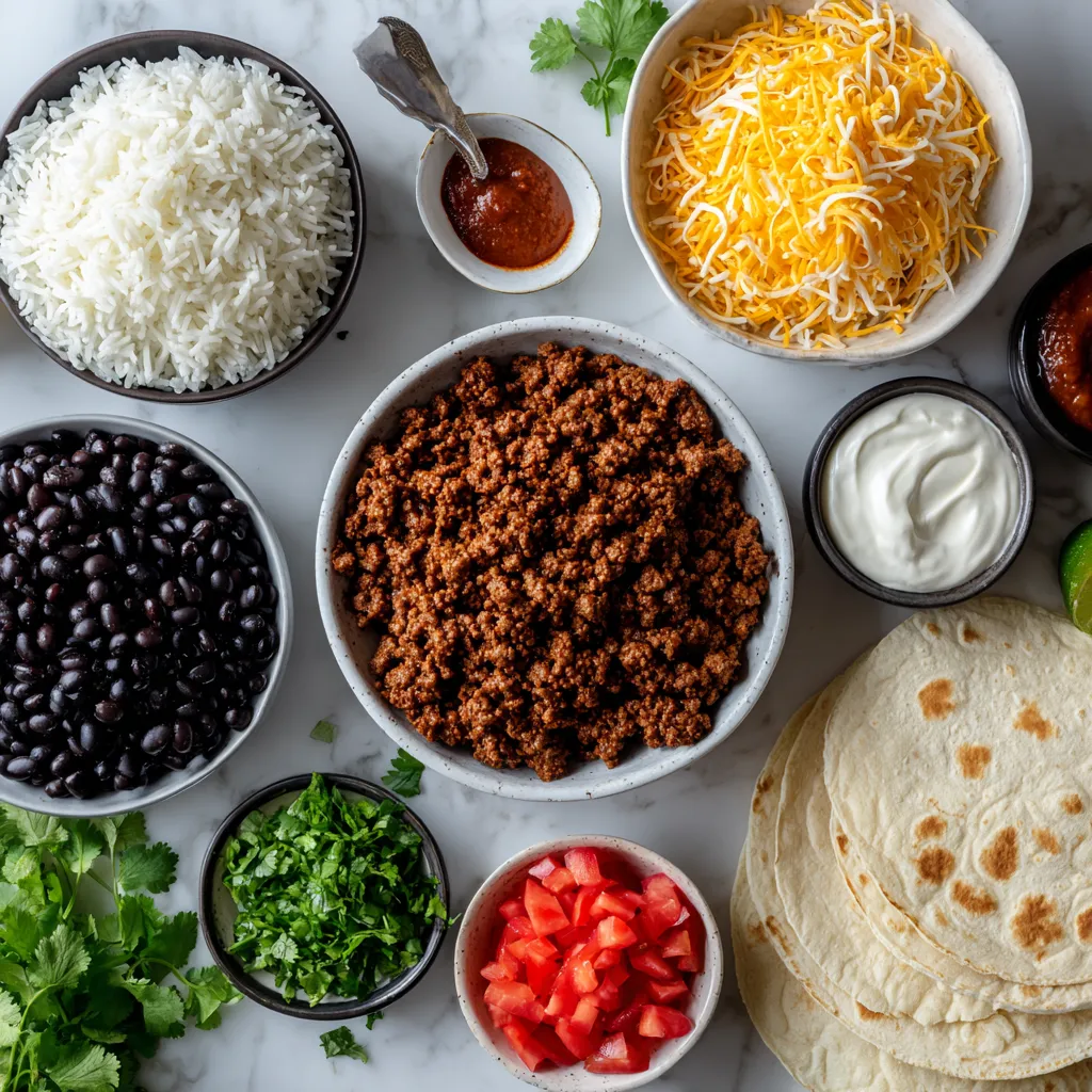 The ingredients for the Beefy Melt Burrito come together with ease. First, you need ground beef. This is the base of the flavor. Add some cooked white rice to give it a nice texture. Black beans are next. They bring protein and fiber. Don’t forget the shredded cheddar cheese. It melts beautifully and adds richness.