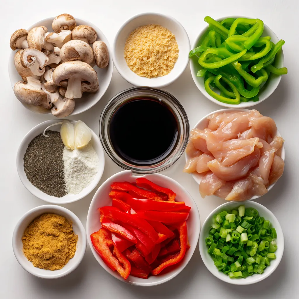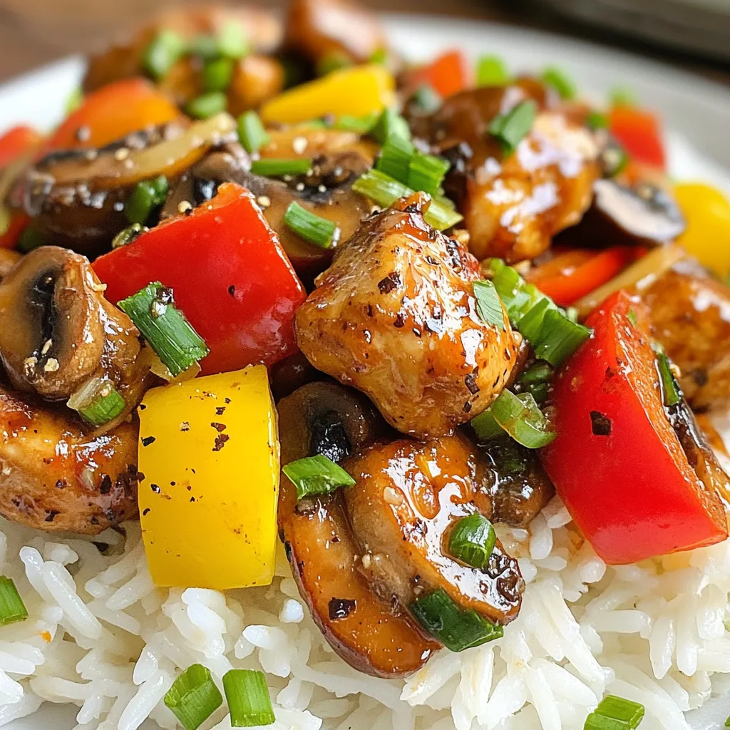 A flavorful stir-fry featuring tender chicken, mushrooms, and bell peppers in a savory black pepper sauce.