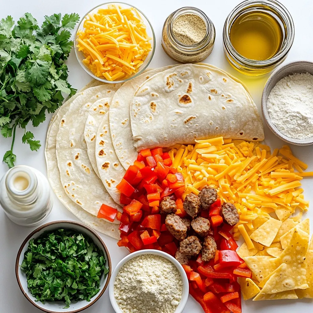 To make breakfast enchiladas with sausage gravy, you need simple ingredients. Each one adds great flavor. The flour tortillas hold everything together. Eggs bring protein and a nice texture. Bell peppers and onions give color and taste. Cheddar cheese adds creaminess and richness. The breakfast sausage adds a savory kick.