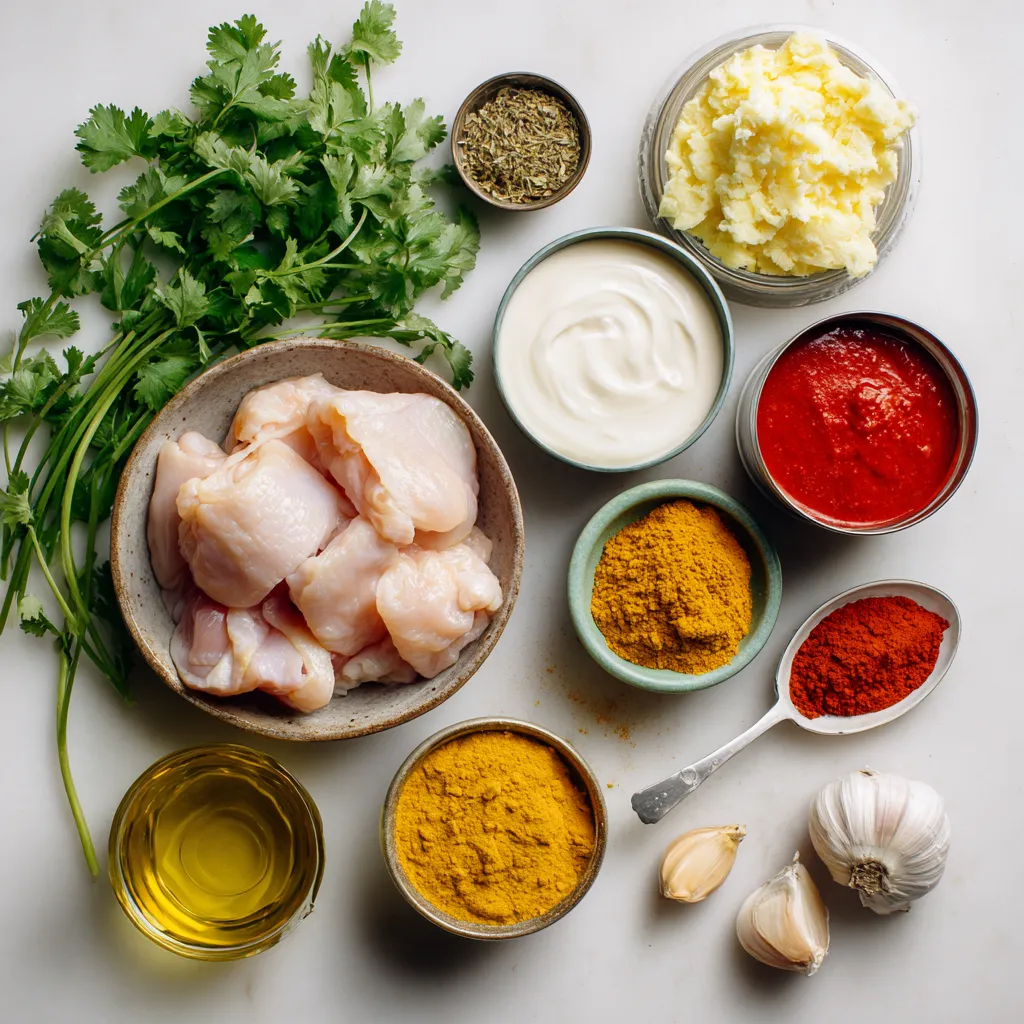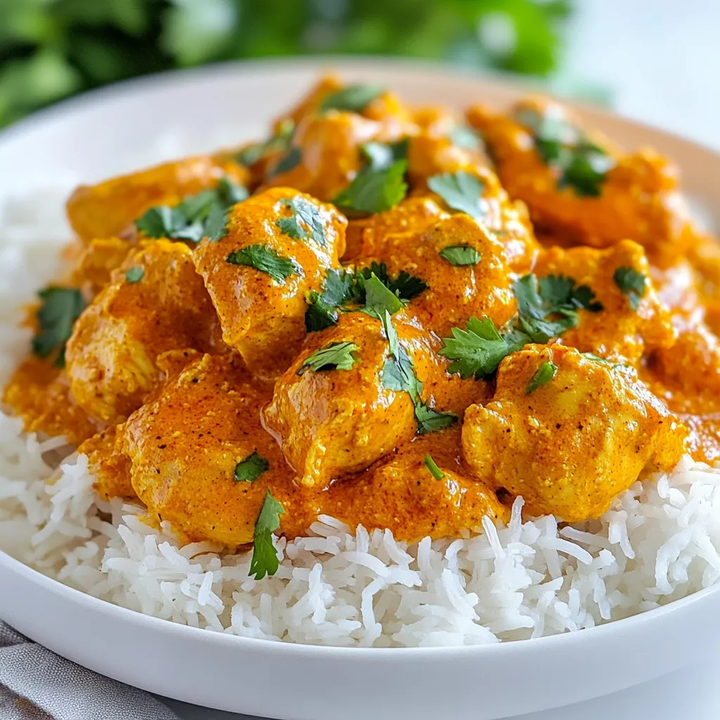 To make Butter Chicken with Garlic Sauce, you will need: - 500g boneless chicken thighs, cut into bite-sized pieces - 1 cup plain yogurt - 2 tablespoons tandoori masala - 1 tablespoon ginger-garlic paste - 3 tablespoons butter - 1 large onion, finely chopped - 1 can (400g) crushed tomatoes - 1 teaspoon garam masala - 1 teaspoon ground cumin - 1 teaspoon ground coriander - 1/2 teaspoon turmeric powder - 1/2 cup heavy cream - Salt and pepper to taste - Fresh cilantro, chopped (for garnish) - 6 cloves garlic, minced - 2 tablespoons olive oil If you can't find certain items, there are some easy swaps: - Chicken thighs can be replaced with chicken breast for a leaner option. - Use Greek yogurt instead of plain yogurt for extra creaminess. - If you lack tandoori masala, a mix of cumin, paprika, and chili powder works well. - You can skip heavy cream and use coconut milk for a lighter sauce. Marinating makes chicken tender and flavorful. Here’s how: - Combine chicken, yogurt, tandoori masala, and ginger-garlic paste in a bowl. - Cover it with plastic wrap and refrigerate. - Aim for at least one hour of marinating time. For best results, let it sit overnight. - This allows the spices to infuse deeply into the meat. Marinating is key for great taste in Butter Chicken with Garlic Sauce. {{ingredient_image_1}} Start by taking 500g of boneless chicken thighs. Cut them into bite-sized pieces. In a medium bowl, mix the chicken with 1 cup of plain yogurt, 2 tablespoons of tandoori masala, and 1 tablespoon of ginger-garlic paste. Stir everything well. Cover the bowl with plastic wrap. Place it in the fridge for at least 1 hour. For best results, marinate overnight. This step makes the chicken juicy and flavorful. Next, heat 2 tablespoons of butter in a large skillet over medium heat. Once melted, add 1 large onion, finely chopped. Sauté the onion for about 5-7 minutes until it turns translucent and golden. This adds depth to your dish. Now, add the marinated chicken pieces to the skillet. Cook for 8-10 minutes, stirring occasionally. You want the chicken browned on all sides. After browning the chicken, it’s time to add flavor. Stir in 1 can of crushed tomatoes, along with 1 teaspoon of garam masala, 1 teaspoon of ground cumin, 1 teaspoon of ground coriander, and 1/2 teaspoon of turmeric powder. Season with salt and pepper to taste. Bring this mixture to a gentle simmer. Let it cook for about 15 minutes. This allows the spices to meld and create a rich sauce. In a separate small saucepan, heat 1 tablespoon of butter and 2 tablespoons of olive oil over medium heat. Add 6 cloves of minced garlic. Sauté the garlic for 1-2 minutes until fragrant. Be careful not to burn it, as burnt garlic tastes bitter. This garlic butter sauce adds a wonderful layer to your dish. Once the chicken is cooked through, stir in the garlic butter and 1/2 cup of heavy cream into the skillet. Let it cook for another 5 minutes, stirring gently. This makes the sauce creamy and rich. Taste the dish and adjust the seasoning if needed. Finally, remove from heat and garnish with fresh chopped cilantro before serving. Enjoy your Butter Chicken with Garlic Sauce! The marinade is key for great Butter Chicken. Use plain yogurt to tenderize the chicken. The acid in yogurt breaks down the meat, making it juicy and soft. Mix in tandoori masala and ginger-garlic paste for rich flavor. I recommend marinating for at least one hour, but overnight works best. This gives the spices time to soak in. The sauce should be creamy and smooth. Use heavy cream to get that rich texture. After cooking, adjust the thickness by adding more cream or a little water. If it’s too thick, don’t worry! Just add a splash of water or more cream to reach your desired consistency. Stir gently to blend everything well. Want to elevate your Butter Chicken? Add a pinch of sugar to balance the acidity of the tomatoes. Fresh cilantro adds a bright finish. If you love garlic, use more minced garlic in the sauce. You can also sprinkle in a bit of lemon juice for extra zing. This enhances the flavor and makes each bite pop. Pro Tips Marinate for Maximum Flavor: The longer you marinate the chicken, the more flavorful it will be. Aim for at least 1 hour, but overnight is ideal for deep flavor penetration. Perfectly Sautéed Onions: Ensure your onions are cooked until they are golden brown; this adds a rich sweetness to the dish that enhances the overall flavor. Control the Heat: Adjust the heat while cooking to prevent burning the spices. A gentle simmer allows the spices to release their flavors without scorching. Finish with Freshness: Adding cilantro at the end not only brightens the dish but also adds a fresh aroma. You can also drizzle a little extra cream for a touch of elegance. {{image_2}} You can swap chicken for other proteins. Try shrimp or fish for a fresh twist. Tofu is a great choice for a plant-based dish. Each protein brings its own flavor and texture. Adjust cooking times based on what you choose. Shrimp cooks quickly, while fish may need a bit more time. To make this dish vegetarian, use paneer or chickpeas. Paneer adds a creamy texture, while chickpeas provide protein and fiber. Follow the same cooking steps. Marinate paneer just like chicken for added flavor. Feel free to add more veggies, like bell peppers or spinach. They will add color and nutrition to the dish. If you love spice, add more heat! Use fresh chopped chilies or cayenne pepper. You can also try adding a dash of chili powder to the sauce. Adjust spices to your taste. Start small and increase until it’s just right for you. Serve with cooling yogurt or raita to balance the heat. To keep your Butter Chicken with Garlic Sauce fresh, let it cool down. Store the leftovers in an airtight container. You can keep it in the fridge for up to three days. Make sure to label the container with the date. This helps you remember when you made it. When you’re ready to enjoy your leftovers, reheat them