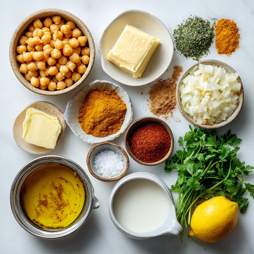 To make butter chickpeas, start by gathering your ingredients. You need canned chickpeas, butter, onion, garlic, ginger, tomato paste, spices, coconut milk, salt, and pepper.