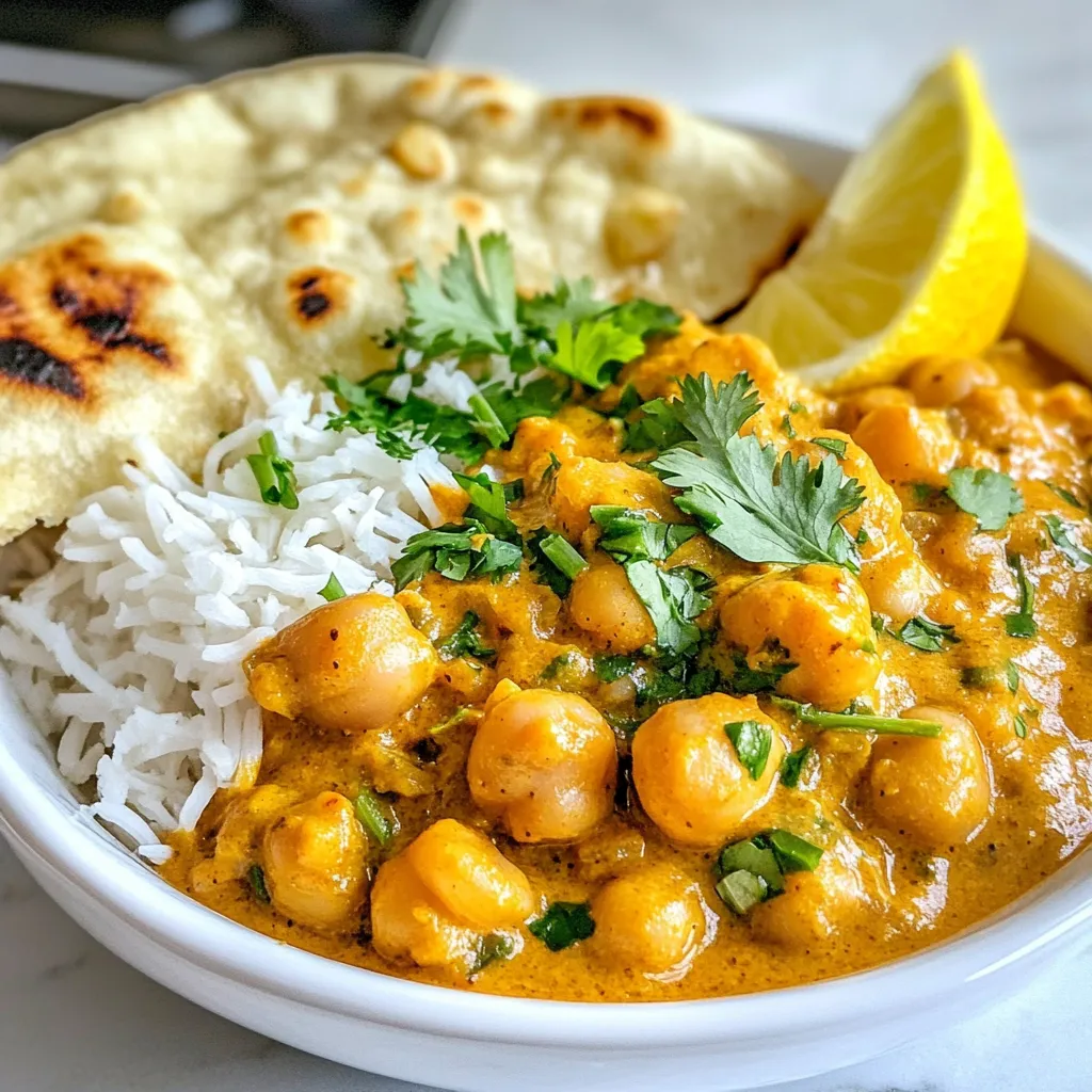 A rich and creamy chickpea dish cooked with spices and coconut milk, perfect for a comforting meal.