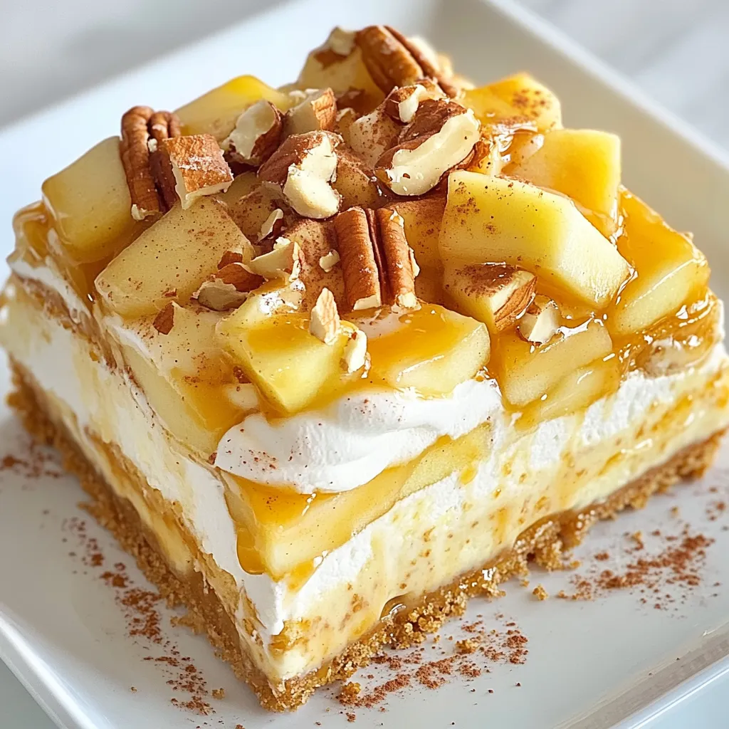 A delicious layered dessert featuring graham crackers, creamy filling, apples, and caramel.