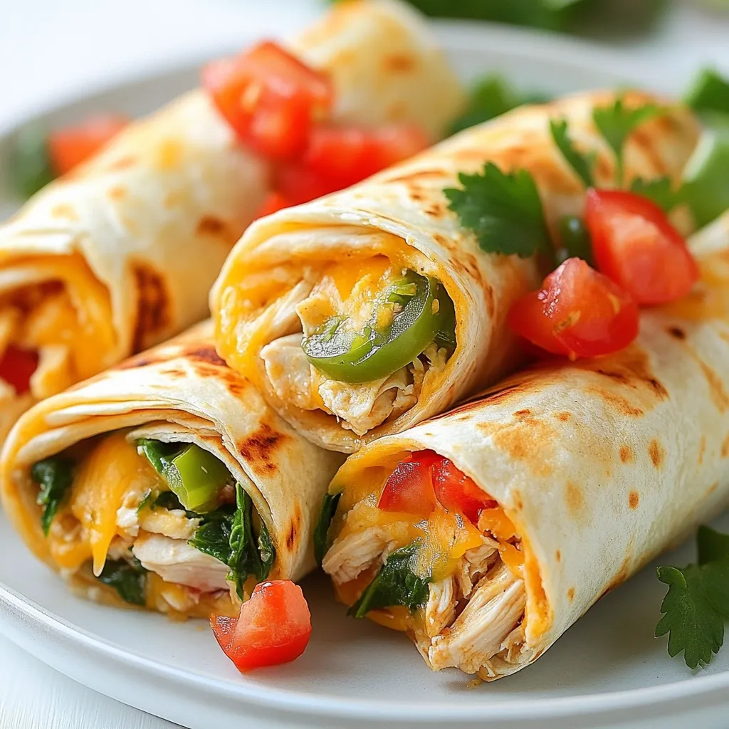 Delicious wraps filled with cheesy shredded chicken and fresh spinach, perfect for a quick meal.