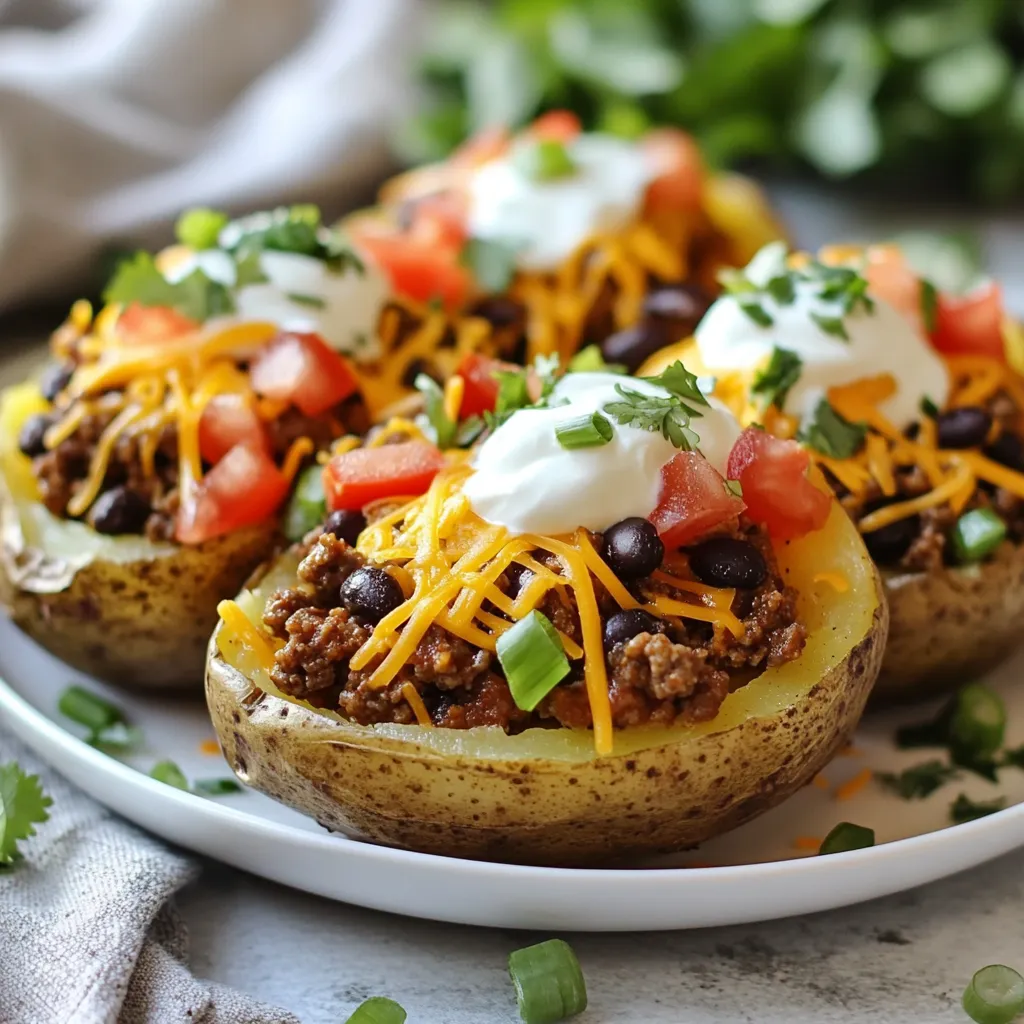 - 4 large russet potatoes - 1 lb ground beef (or turkey) - 1 packet taco seasoning - 1 cup black beans (drained and rinsed) - 1 cup corn kernels (fresh or canned) - 1 cup shredded cheddar cheese - 1 cup sour cream - 1 medium tomato (diced) - 1/4 cup green onions (finely chopped) - 1/4 cup fresh cilantro (chopped) - Salt and pepper to taste - Olive oil for brushing Gathering the right ingredients is key for Cheesy Taco Potatoes. Start with russet potatoes. They have the perfect texture for baking. You need four large ones to make sure everyone gets a hearty serving. Next, choose between ground beef or turkey. Both work well with taco seasoning. The taco seasoning adds a burst of flavor. One packet is all you need. Don't forget the black beans. They add protein and fiber. Rinse and drain one cup before using. Corn kernels bring sweetness and crunch. You can use fresh corn or canned. Cheddar cheese is essential for that gooey, cheesy topping. You want one cup of shredded cheese. Sour cream brings creaminess and balances the spice. For a fresh touch, add diced tomatoes, green onions, and cilantro. They add color and flavor to your dish. Lastly, season with salt and pepper. A light brush of olive oil on the potatoes helps them bake perfectly. With these ingredients ready, you can create a flavorful and filling meal. {{ingredient_image_1}} - Preheat oven to 400°F (200°C). - Wash and scrub the russet potatoes. - Pierce each potato several times with a fork. - Brush potatoes lightly with olive oil. - Sprinkle salt over the potatoes for flavor. - Place the potatoes directly on the oven rack or on a baking tray. - Bake for about 45–60 minutes. - Check if they are tender by piercing with a fork. - Heat a skillet over medium-high heat. - Add ground beef and taco seasoning to the skillet. - Cook until the beef is browned, about 5–7 minutes. - Stir in black beans and corn, heat until warm. - Season the mixture with salt and pepper to taste. - Once baked, remove potatoes from the oven. - Let them cool slightly before handling. - Cut each potato lengthwise to create a pocket. - Use a fork to fluff the insides of the potatoes. - Fill each potato generously with the taco meat mixture. - Top with shredded cheddar cheese. - Return to the oven for 5–10 minutes until the cheese melts. - Remove and drizzle with sour cream, then add toppings like diced tomatoes, green onions, and cilantro. How to know when potatoes are done To check if your potatoes are ready, poke them with a fork. If the fork goes in easily, they are done. It usually takes 45–60 minutes at 400°F. You can also squeeze the potato gently; it should feel soft. Best practices for filling the potatoes After baking, cut the potatoes lengthwise. Use a fork to fluff the insides, making space for the filling. Be generous with the taco meat mix. It helps if you slightly mash the insides for a creamy texture. Presentation ideas for serving Serve your Cheesy Taco Potatoes on a large platter. Line the platter with fresh lettuce leaves. This adds color and a crisp touch. You can also place lime wedges around for zest. Garnishing options for added flavor Finish with a drizzle of sour cream on top. Add fresh diced tomatoes, green onions, and cilantro. These toppings bring freshness and a pop of color. A sprinkle of cheese on top makes it even better! Recommended side dishes Pair your Cheesy Taco Potatoes with a simple salad. A side of Mexican rice also works well. You can serve some chips and salsa for extra crunch. Beverage pairings to complement the meal Enjoy your potatoes with iced tea or lemonade. A light beer or a margarita can also enhance the meal. Choose what you love for a fun dining experience! Pro Tips Choose the Right Potatoes: For the best texture, opt for russet potatoes as they are fluffy and ideal for baking. Customize Your Filling: Feel free to add other ingredients like jalapeños or avocado for extra flavor and texture. Let Them Cool: After baking, let the potatoes cool for a few minutes before cutting to prevent burns and make handling easier. Make Ahead: You can prepare the filling in advance and store it in the fridge, making assembly quick and easy at mealtime. {{image_2}} You can swap the ground beef for other meats. Ground turkey or chicken works well. If you prefer plants, try lentils or crumbled tofu. For cheese, cheddar is great, but Monterey Jack adds a nice touch. Pepper Jack boosts the heat, so choose what you love. Spices can elevate your taco potatoes. Add cumin for warmth or chili powder for kick. Chopped bell peppers add sweetness while jalapeños bring the heat. These little tweaks can make a big difference. Think about what flavors you enjoy. To make this dish vegetarian, skip the meat. Use beans, lentils, or veggies to fill the potatoes. For a vegan option, replace sour cream with dairy-free yogurt. If you're watching carbs, try using cauliflower or zucchini instead of potatoes. You can still enjoy all that cheesy goodness! To store leftover Cheesy Taco Potatoes, let them cool first. Place them in an airtight container. This keeps the potatoes fresh. You can also wrap them in plastic wrap. Make sure they are sealed tight to prevent air from getting in. For best results, store them in the fridge. For reheating, the oven works best. Heat your oven to 350°F (175°C). Place the potatoes on a baking sheet. Cover them with foil to keep them moist. Bake for about 15-20 minutes, or until heated through. You can also use a microwave. Just put them on a microwave-safe plate. Heat for 1-2 minutes, checking to avoid overheating. Yes, you can freeze Cheesy Taco Potatoes. Start by letting them cool completely. This helps prevent ice crystals. Wrap each potato in plastic wrap, then in aluminum foil. This double layer protects them from freezer burn. Place the wrapped potatoes in a freezer bag. Squeeze out extra air before sealing. To thaw, place the potatoes in the fridge overnight. This keeps them safe. You can also use th