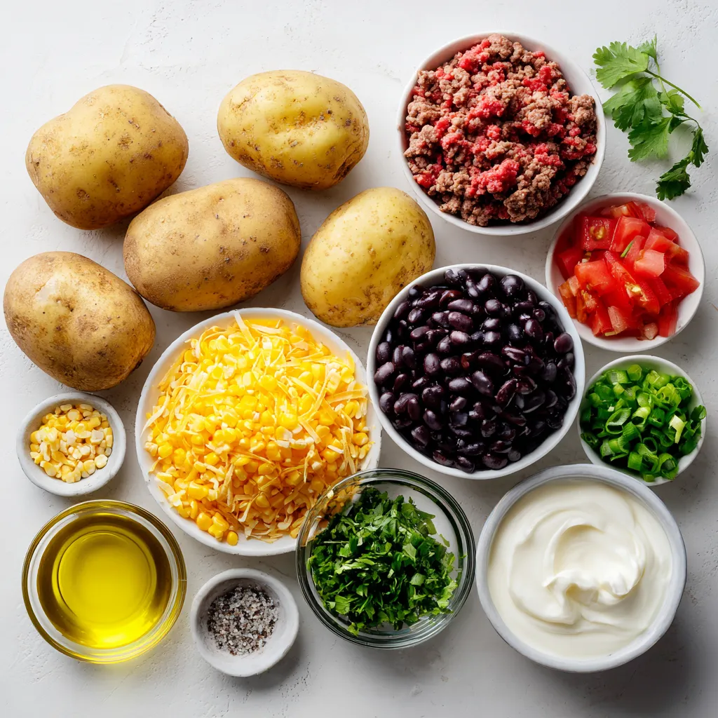 Gathering the right ingredients is key for Cheesy Taco Potatoes. Start with russet potatoes. They have the perfect texture for baking. You need four large ones to make sure everyone gets a hearty serving.