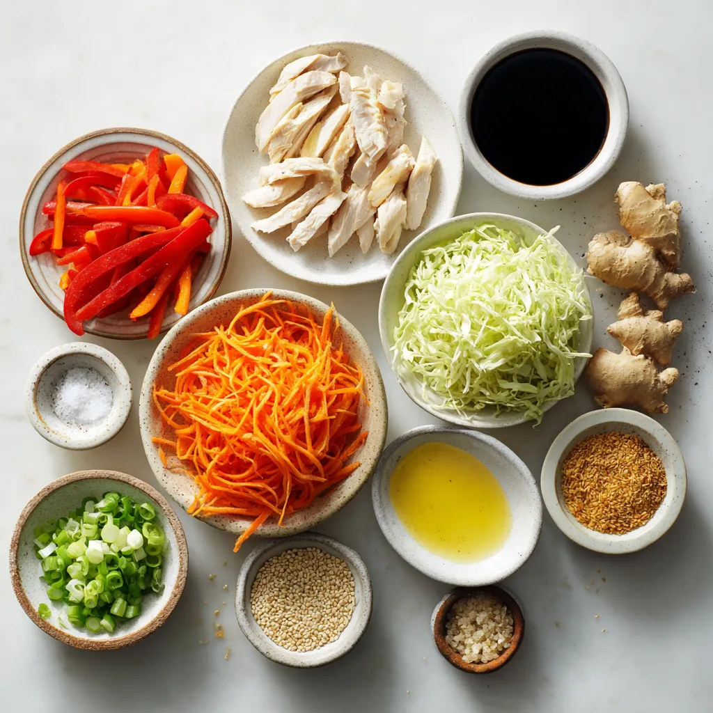 Gathering your ingredients is key to a great stir fry. I love to use fresh chicken. Thin slices cook quickly and stay juicy. The green cabbage adds a nice crunch. I find red bell pepper adds a sweet touch. Carrots give color and a bit of sweetness, too. Green onions bring a fresh taste.