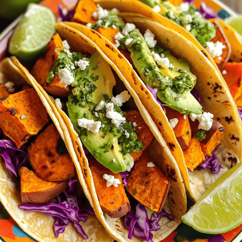 - 2 medium sweet potatoes, peeled and diced - 2 tablespoons olive oil - 1 teaspoon chili powder - 1/2 teaspoon cumin - 1/2 teaspoon smoked paprika - Salt and pepper to taste - 1 avocado, sliced - 1 cup red cabbage, shredded - 1/4 cup fresh cilantro, chopped - 2 tablespoons lime juice - 8 small corn tortillas - 1/4 cup crumbled feta cheese (optional) To make Chili Lime Sweet Potato Tacos, we need fresh and tasty ingredients. Sweet potatoes give a nice, sweet base. Olive oil helps with roasting and adds flavor. For spice, I use chili powder, cumin, and smoked paprika. These spices bring warmth and depth. You can add salt and pepper to suit your taste. Fresh toppings like avocado, red cabbage, and cilantro brighten each bite. A squeeze of lime juice adds a zesty kick. If you want creaminess, sprinkle feta cheese on top. - Calories per serving: About 300 - Macronutrient breakdown: - Carbohydrates: 45g - Fats: 10g - Proteins: 6g This meal is vegan and gluten-free if you skip the feta cheese. It’s a balanced dish, rich in vitamins and minerals. Sweet potatoes are high in fiber and good for digestion. Each taco offers a burst of flavor and nutrition. For the full recipe, check out the details above. Enjoy! First, preheat your oven to 425°F (220°C). This step is key for crispy sweet potatoes. While the oven heats, prepare a baking sheet by lining it with parchment paper. Next, take two medium sweet potatoes, peel and dice them into small cubes. In a large bowl, toss the diced sweet potatoes with two tablespoons of olive oil. Add one teaspoon of chili powder, half a teaspoon of cumin, half a teaspoon of smoked paprika, and sprinkle in salt and pepper to taste. Make sure every piece is well-coated. This will enhance the flavor. Spread the seasoned sweet potatoes on the baking sheet in a single layer. Bake them for 25 to 30 minutes. Stir the sweet potatoes halfway through for even roasting. You want them to be tender and caramelized. Keep an eye on them. If they brown too fast, reduce the heat slightly. While the sweet potatoes roast, warm your tortillas. Use a skillet over medium heat. Heat each tortilla for about 30 seconds on each side until they feel soft and pliable. Now it’s time to assemble your tacos! Start with a generous amount of roasted sweet potatoes on each tortilla. Next, add sliced avocado and shredded red cabbage. Drizzle with a mix of lime juice and chopped cilantro for that fresh zing. If you like, sprinkle crumbled feta cheese on top. This combination brings the flavors to life. For the full recipe, check out the details above. To make these tacos truly shine, adjust the spices to fit your taste. If you enjoy heat, add more chili powder or toss in a pinch of cayenne. For a milder flavor, reduce the chili powder. You can also swap spices. Try adding garlic powder or onion powder for warmth. When it comes to toppings, the options are endless. Instead of avocado, use fresh mango or pineapple for sweetness. You can also add diced tomatoes or radishes for a crunch. Each topping brings its own twist, making the dish unique. Roasting sweet potatoes requires some care. Cut them into even pieces to ensure they cook uniformly. Toss them well in olive oil and spices to enhance their flavor. Spread them out on the sheet, ensuring they don't overlap. This allows for even roasting and a nice caramelized finish. Warming tortillas is simple. Heat a skillet over medium heat. Place the tortillas one at a time for about 30 seconds on each side. This softens them and makes them easy to fold. You can also wrap them in a damp paper towel and warm them in the microwave for about 20 seconds. Visual appeal enhances the meal experience. Serve the tacos on a bright platter to make them pop. Add lime wedges on the side for a burst of color and flavor. Garnish with extra cilantro to create a fresh look. For plating, layer the tacos vertically. This creates height and makes the dish look inviting. You can also drizzle the cilantro-lime mixture over the top. It adds a glossy finish and makes the tacos even more attractive. For the full recipe, check out the details above. {{image_2}} To make these tacos entirely plant-based, skip the feta cheese. Instead, try using a vegan cheese or cashew cream. Both options add a creamy texture without dairy. You can also add more lime juice for a zesty kick. For a gluten-free meal, choose corn tortillas. They work perfectly with sweet potatoes. You can also serve the tacos with a side of black beans or quinoa. These sides keep it hearty and gluten-free. Want to add more protein? Cooked black beans or lentils fit well in these tacos. You can also use shredded chicken or beef. Just season the meat with chili powder and lime juice for great flavor. Cook the meat in a skillet until it's warm, then add it to the tacos. For the full recipe, check out the steps to make these tasty Chili Lime Sweet Potato Tacos! To keep your tacos fresh, store them in an airtight container. Place the tacos in the fridge within two hours of cooking. Do not stack them, as they can get soggy. For the toppings, store them in separate containers. This keeps the avocado and cabbage crispy. Use plastic wrap or lids to cover them well. To freeze roasted sweet potatoes, first let them cool completely. Spread them out on a baking sheet. Freeze them for about one hour until firm. Then, transfer them to a freezer bag. Seal it tightly to prevent freezer burn. When ready to eat, thaw the sweet potatoes in the fridge overnight. Reheat them in the oven or a skillet until hot. This keeps them tasty and firm. In the fridge, your tacos last for about 3 days. If you freeze the sweet potatoes, they can last up to 3 months. Always check for any signs of spoilage before eating. Yes, you can! Some great alternatives are bell peppers, zucchini, or mushrooms. These veggies add unique flavors and textures. For bell peppers, roast for about 20 minutes. Zucchini needs about 15 minutes, while mushrooms can roast in just 