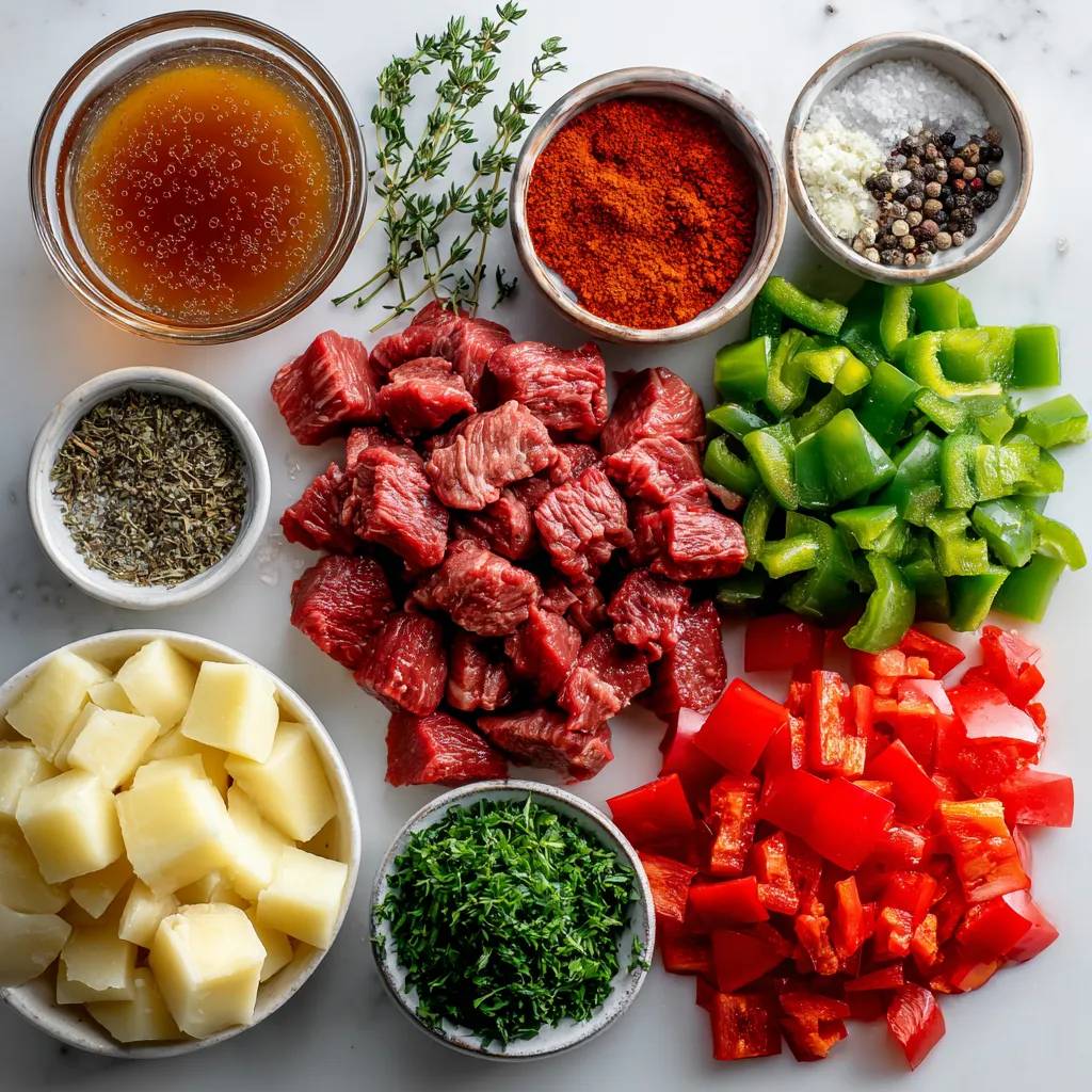 – Spices and Seasonings: For spice, include 2 tablespoons of sweet paprika. This gives the goulash its signature color. Add 1 teaspoon of caraway seeds for a unique taste. Include 1 teaspoon of dried thyme for a herby touch. Season with salt and pepper to taste.