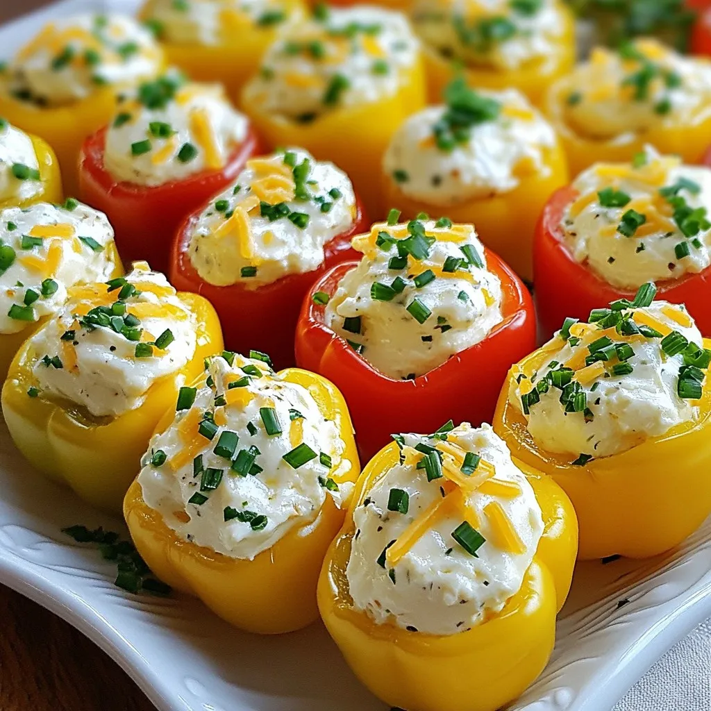 Delicious mini bell peppers stuffed with a creamy cheese mixture, perfect as an appetizer or party snack.