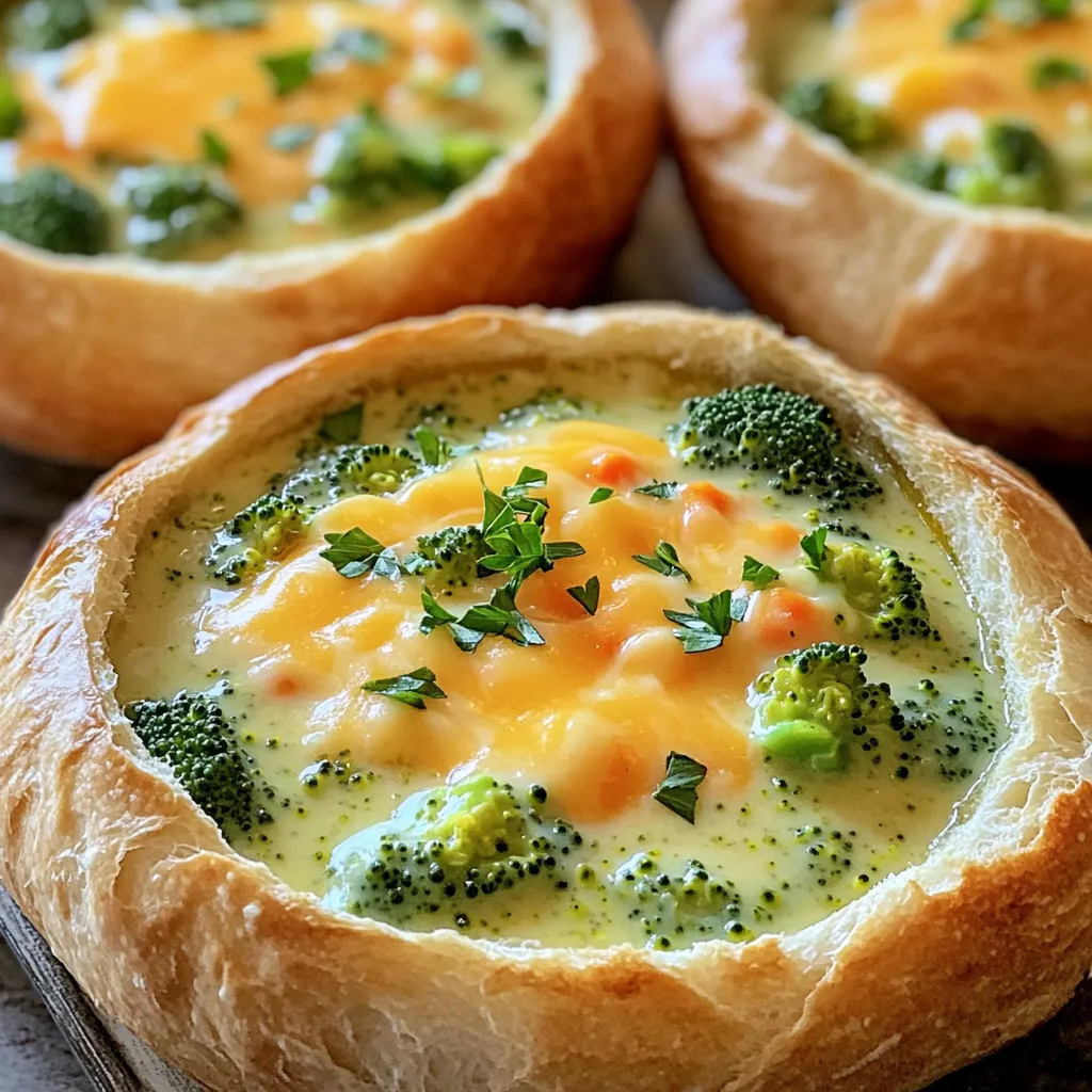 - 1 large head of broccoli, chopped into florets - 1 cup carrots, diced - 1 medium onion, chopped - 2 cloves garlic, minced - 4 cups vegetable broth - 1 cup heavy cream - 2 cups sharp cheddar cheese, shredded - 2 tablespoons olive oil - 1 tablespoon butter - 1 teaspoon salt - 1/2 teaspoon black pepper - 1/2 teaspoon nutmeg - 4 large round bread loaves (like sourdough or boule) To make this soup, you need fresh vegetables. The broccoli and carrots add color and taste. The onion and garlic bring in flavor. For the broth, use vegetable broth, which makes the soup rich and hearty. Heavy cream gives the soup its creamy texture. Sharp cheddar cheese adds a nice bite. You also need some basic seasonings. Olive oil and butter are key for cooking the vegetables. Salt, black pepper, and nutmeg enhance all the flavors. Finally, choose your bread wisely. Sourdough or boule works best. They hold up well and taste great with the soup. This combination of ingredients will create a delicious, warm meal in a bread bowl. First, preheat your oven to 350°F (175°C). This helps crisp the bread bowls. Next, take your large round bread loaves and cut off the tops. Make sure to leave about 1 inch of bread on the sides and bottom. This keeps the soup from leaking out. Hollow out the insides gently with your hands or a spoon. Brush the insides with olive oil and sprinkle a little salt. This adds flavor and helps toast them. Place the bread bowls on a baking sheet and bake for about 10 minutes. You want them to be slightly toasted, not too hard. Set them aside to cool. In a large pot, heat 2 tablespoons of olive oil and 1 tablespoon of butter over medium heat. Once hot, add the chopped onion and minced garlic. Sauté these until the onion turns translucent, which takes about 3-4 minutes. Now, stir in the chopped broccoli and diced carrots. Cook this mixture for another 5 minutes. Stir occasionally so nothing burns. The veggies should soften a bit and smell great. Next, pour in 4 cups of vegetable broth and bring it to a boil. Once boiling, reduce the heat to low. Let it simmer for about 15 minutes, or until the broccoli and carrots are tender. Use an immersion blender to blend the soup until creamy. You can also carefully transfer the soup to a blender, blend it, and then return it to the pot. Stir in 1 cup of heavy cream, 2 cups of shredded cheddar cheese, 1 teaspoon of salt, 1/2 teaspoon of black pepper, and 1/2 teaspoon of nutmeg. Keep stirring until the cheese melts and the soup is smooth. Now it's time to serve! Ladle the creamy broccoli cheddar soup into your toasted bread bowls. For a nice touch, add some extra shredded cheese, croutons, or chopped parsley on top. These toppings add flavor and make your dish look great. Enjoy every spoonful of this warm, cheesy delight! To make your soup creamy, an immersion blender works best. It blends right in the pot, so you avoid extra dishes. I love it for its ease. If you don’t have one, a regular blender is fine. Just be careful when transferring hot soup. Blend until it's smooth for that creamy texture you want. Add fresh herbs for more flavor. I suggest thyme or rosemary. They pair well with cheese and broccoli. You can also sprinkle in some paprika or cayenne for a kick. These simple additions make your soup exciting and fun to eat. You can make this soup ahead of time. Just store it in the fridge for up to 3 days. When you’re ready to eat, heat it gently on the stove. Stir often to keep it creamy. Avoid boiling to prevent separation. Enjoy your warm soup in a cozy bread bowl! {{image_2}} You can add proteins to make your soup heartier. Chicken is a great choice. Simply cook and shred some chicken before adding it to the pot. This will add flavor and nutrition. Beans are another option. Chickpeas or white beans work well. They blend nicely into the soup and boost protein. If you want a vegan version, you can swap out the cream and cheese. Use coconut cream or cashew cream instead of heavy cream. For cheese, try nutritional yeast. It gives a cheesy flavor without any dairy. These substitutes keep the soup rich and tasty without animal products. Feel free to add more veggies for extra color and nutrients. Spinach or kale can be great additions. They cook quickly and add a nice contrast. You could also add bell peppers for sweetness. Just chop them up and toss them in with the broccoli and carrots. To store leftover soup, let it cool first. Use an airtight container for best results. Place the soup in the fridge. It stays fresh for about three to four days. When you’re ready to eat, reheat it on the stove. Stir often for even heating. You can also microwave it in a bowl. Just cover it with a paper towel to avoid splatters. You can freeze this soup for later. First, let it cool completely. Then, use freezer-safe containers. Leave some space at the top for expansion. The soup can last up to three months in the freezer. To defrost, move it to the fridge overnight. When ready to eat, reheat on the stove over low heat. Stir until it’s warm and creamy again. To keep bread bowls fresh, store them in a paper bag. This keeps them from getting too moist. Avoid plastic bags, as they trap humidity. If you have extra bowls, freeze them in a freezer-safe bag. Just make sure they are sealed well. When you want to use them, let them thaw at room temperature. Then, warm them in the oven for a few minutes before serving. This keeps them crusty and delicious. Yes, you can use frozen broccoli. It works well in this soup. Frozen broccoli is already blanched, so it cooks faster. Just add it to the pot with the carrots after sautéing the onion and garlic. This will save time and still give you a nice texture. If you want a dairy-free option, try coconut milk or cashew cream. Both add creaminess. You can also use unsweetened almond milk with a bit of cornstarch for thickness. Just remember, these alternatives may change the flavor slightly. Adjust seasoning to keep the soup tasty