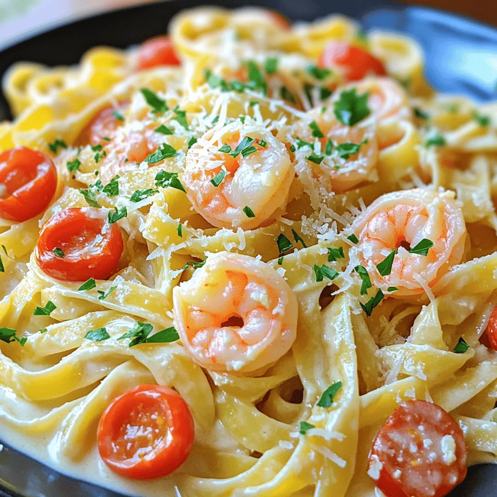 The main ingredients create a rich and tasty meal. Fettuccine or spaghetti works well for this dish. I love using large shrimp for their sweet flavor and firm texture. Garlic is key, giving the pasta its delicious aroma. Heavy cream makes everything creamy and smooth. Broth adds depth to the sauce, while cherry tomatoes bring freshness. Finally, the Parmesan cheese melts beautifully, tying all the flavors together.