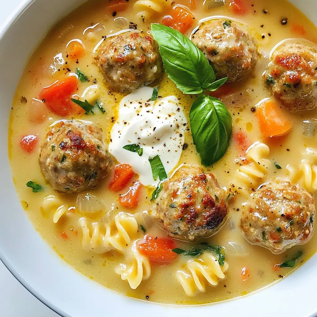 A hearty and creamy soup filled with flavorful meatballs, vegetables, and pasta.