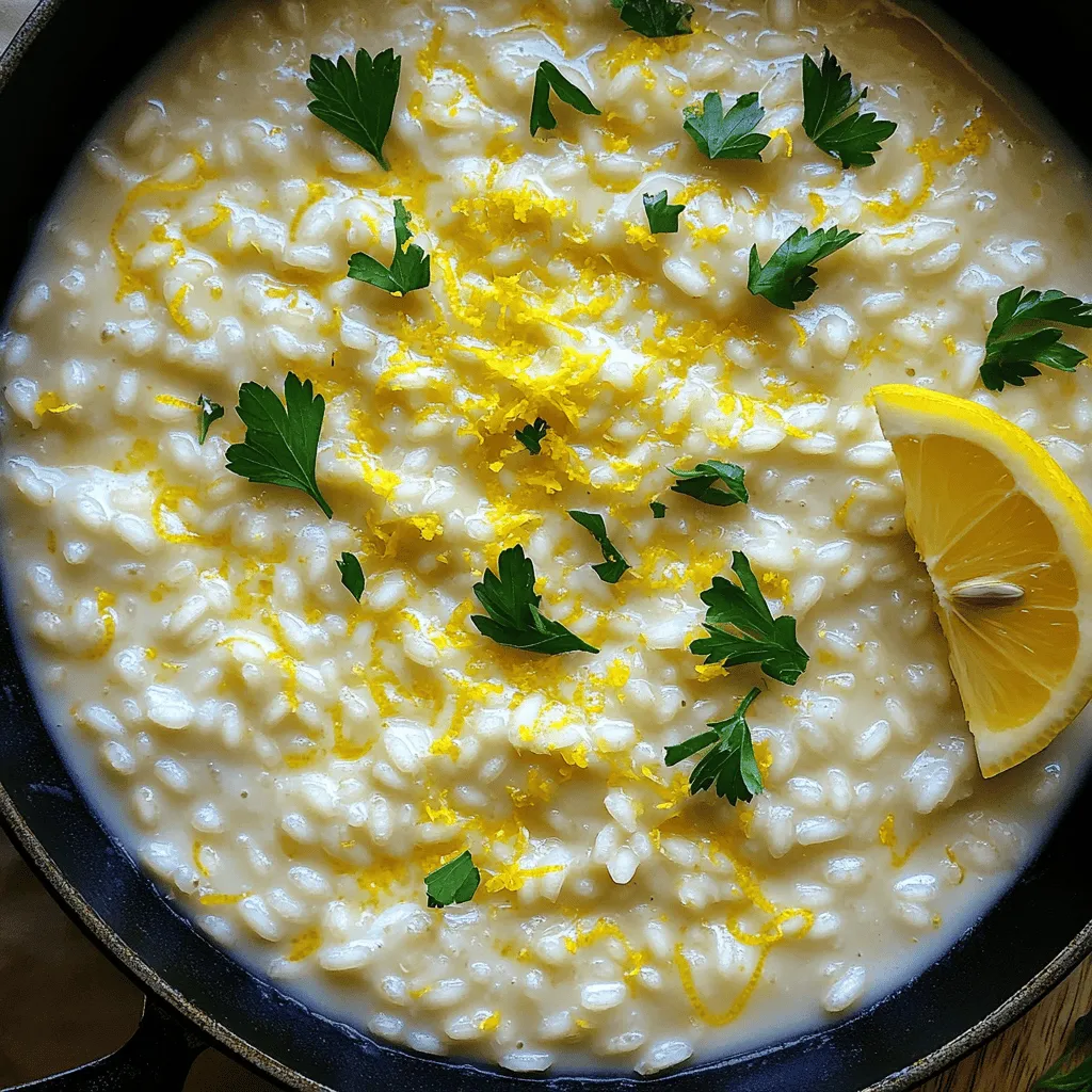 To make a delightful creamy lemon parmesan risotto, gather these key ingredients: - 1 cup Arborio rice - 4 cups vegetable broth, hot - 1 small onion, finely chopped - 2 cloves garlic, minced - 1 tablespoon olive oil - 1 tablespoon butter - 1 lemon, zested and juiced - 1 cup grated Parmesan cheese - ½ cup heavy cream - Salt and pepper to taste - Fresh parsley, chopped (for garnish) These ingredients create a rich, creamy dish that bursts with lemon flavor. Using fresh ingredients makes a big difference in taste. Fresh onions and garlic add more flavor than stored ones. When you zest the lemon, use a bright, firm lemon for the best zest. Fresh Parmesan cheese also melts better than pre-grated cheese. If you can, buy these items close to when you cook. This helps keep your dish vibrant and tasty. You can easily swap some ingredients for different flavors or dietary needs. If you want a lighter dish, use low-fat cream instead of heavy cream. For a vegan option, try using plant-based cheese and broth. If you cannot find Arborio rice, short-grain rice can work. Just remember that it might change the texture a bit. Get creative and make it your own! Start by heating the olive oil and butter in your skillet. Use medium heat until they melt together. Then, add the finely chopped onion. Sauté for about 3 to 4 minutes. You want the onion to turn soft and clear. Next, stir in the minced garlic. Cook for one more minute. You will smell a nice aroma that fills the kitchen. Now it's time to add the Arborio rice. Stir it into the onion and garlic mix. Cook for 2 to 3 minutes. This helps the rice soak up the flavors. After that, pour in ½ cup of hot vegetable broth. Stir it slowly until almost all of the liquid is gone. This step is key for creamy risotto. Keep adding the broth, one ladle at a time. Stir often and let each addition absorb before adding more. This process takes about 18 to 20 minutes. The rice should feel creamy and slightly firm when done. Once your rice is cooked, it's time for the final touches. Stir in the lemon zest and lemon juice. The fresh lemon adds a bright flavor. Then, mix in the heavy cream and grated Parmesan cheese. This makes your risotto rich and creamy. Season with salt and pepper to taste. Let the risotto sit for a couple of minutes. This helps it thicken a bit. Now, you’re ready to serve your creamy lemon Parmesan risotto! To get that creamy texture in your risotto, use Arborio rice. This rice has a high starch content, which helps create creaminess. Always add hot broth gradually. This means adding a ladle at a time. Stir often and wait until the liquid is mostly gone before adding more. This process should take about 18-20 minutes. When done, the risotto should be soft but still a bit firm. A common mistake is adding all the broth at once. This can lead to uneven cooking. Another mistake is not stirring enough. Stirring helps release the starch, making the risotto creamy. Also, avoid using cold broth. Cold broth can shock the rice, slowing down cooking. Lastly, don’t skip the resting time. Letting the risotto sit for a few minutes helps it thicken nicely. To boost flavors, try adding herbs like thyme or basil. You can also mix in sautéed mushrooms or peas for extra taste. For a twist, add a splash of white wine when cooking the onions. This adds depth and brightness. Lastly, don’t be shy with the lemon zest and juice. They brighten the dish and enhance the creamy flavor. {{image_2}} You can make creamy lemon Parmesan risotto even more filling by adding protein. Here are some great options: - Chicken: Cook small pieces of chicken breast until golden and add them to the risotto. - Shrimp: Sauté shrimp in garlic and olive oil. Mix them into the risotto right before serving. - Sausage: Use Italian sausage for a spicy kick. Brown it first, then stir it in. - Tofu: For a vegetarian option, sauté firm tofu cubes until crisp and add them. Adding protein gives you more flavor and makes the dish more satisfying. You can change the taste of your risotto by adding seasonal vegetables. Here are some ideas: - Asparagus: Add cut asparagus toward the end of cooking for a fresh crunch. - Peas: Stir in frozen peas just before serving for a pop of color and sweetness. - Mushrooms: Sauté sliced mushrooms before adding them for an earthy flavor. - Spinach: Toss in fresh spinach leaves at the end. They wilt quickly and add nutrition. Using seasonal veggies keeps the dish fresh and exciting. While Parmesan cheese is classic, you can switch things up with other cheeses. Here’s how: - Pecorino Romano: This cheese adds a sharp, salty flavor that can brighten the dish. - Fontina: Use it for a creamy texture and rich taste. - Goat Cheese: Crumble goat cheese on top for a tangy finish. - Cheddar: Mixing in sharp cheddar gives a different flavor and creamy feel. Trying different cheeses can lead to unique and tasty results. To store leftover risotto, let it cool first. Place it in an airtight container. Make sure to seal it well. It will stay fresh in the fridge for up to three days. If you want to keep it longer, freezing is a good option. Just remember to separate it into smaller portions. This makes it easier to thaw later. For reheating, use a skillet or a pot. Add a splash of broth or water to keep it moist. Heat it over low to medium heat. Stir often to prevent sticking. This helps bring back that creamy texture. You can also use the microwave. Just cover it and heat in short bursts, stirring in between. To freeze risotto, portion it into containers or freezer bags. Label them with the date. Risotto can be frozen for up to three months. When you're ready to eat, thaw it overnight in the fridge. Reheat as mentioned before. Note that the texture may change slightly, but it will still taste great! Yes, you can make risotto in advance. However, it does not hold well. The rice absorbs liquid and becomes thicker when stored. If you make it early, keep it in an airtight container. W