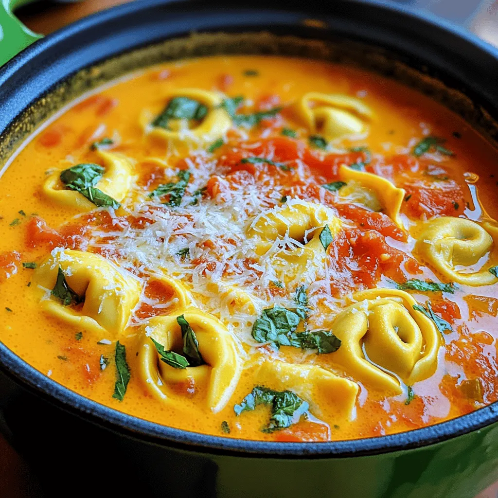 - 1 tablespoon olive oil - 1 onion, chopped - 3 garlic cloves, minced - 1 can (28 oz) crushed tomatoes - 4 cups vegetable broth - 1 teaspoon dried oregano - 1 teaspoon dried basil - 1/4 teaspoon red pepper flakes (optional) - 2 cups refrigerated cheese tortellini - 1 cup heavy cream - 1 cup fresh basil leaves, chopped - Salt and pepper to taste - Grated Parmesan cheese for serving The base of this creamy tomato basil tortellini soup starts with olive oil. You need just one tablespoon. It adds a nice richness. Next, chop one onion and mince three garlic cloves. These aromatics bring depth to your soup. You will also use one 28-ounce can of crushed tomatoes. This gives your soup a fresh and tangy flavor. For the liquid, four cups of vegetable broth add heartiness. Dried oregano and dried basil add classic Italian flavors. Use one teaspoon each. If you like a little heat, add a quarter teaspoon of red pepper flakes. For the main event, you will need two cups of refrigerated cheese tortellini. This makes the soup filling and fun. To finish it off, one cup of heavy cream adds creaminess. Don’t forget fresh basil! One cup, chopped, adds a burst of color and flavor. Use salt and pepper to taste. Finally, serve with grated Parmesan cheese for a savory twist. - 1/4 teaspoon red pepper flakes - Grated Parmesan cheese If you enjoy a little spice, consider adding red pepper flakes. It’s optional, but it can kick up the flavor! You can use grated Parmesan cheese as a topping. It makes your soup even more delicious. 1. Heating the olive oil In a large pot, pour in 1 tablespoon of olive oil. Heat it over medium heat. You want the oil hot but not smoking. 2. Sautéing onion and garlic Next, add 1 chopped onion to the pot. Cook it for about 5 minutes until it softens. Then, add 3 minced garlic cloves. Stir and cook for 1 more minute. The kitchen will smell great! 3. Adding tomatoes and broth Now, open a 28-ounce can of crushed tomatoes. Pour it into the pot. Add 4 cups of vegetable broth next. Stir in 1 teaspoon of dried oregano and 1 teaspoon of dried basil. If you like spice, add 1/4 teaspoon of red pepper flakes. 4. Seasoning the soup Bring the soup to a simmer. This means small bubbles will form on the surface. It should take about 15 minutes. Stir it occasionally to mix the flavors well. 5. Simmering for flavor blending Let the soup simmer and watch as the flavors blend together. This step is key for a rich taste. 6. Incorporating the tortellini Now, it’s time to add the fun part! Stir in 2 cups of refrigerated cheese tortellini. Cook it according to the package instructions. This usually takes about 3 to 5 minutes. 7. Mixing in the heavy cream Lower the heat once the tortellini is ready. Slowly pour in 1 cup of heavy cream. Stir gently to mix everything. 8. Final seasoning adjustments Lastly, add fresh basil leaves that you chopped. Season with salt and pepper to taste. Heat through but don’t let it boil. Your soup is ready to serve! - Ensuring the right pasta doneness: Cook the tortellini until just al dente. This means it should be firm but not hard. The pasta will continue to cook in the soup. - Avoiding boiling after adding cream: Lower the heat before adding heavy cream. Boiling can cause the cream to separate. Stir gently to blend it smoothly. - Garnishing options: Top with grated Parmesan cheese and fresh basil leaves. This adds flavor and a nice look. - Pairing with bread or salads: Serve with crusty bread or a fresh salad. This complements the soup and makes it a full meal. - Adjusting spice levels: Add more or less red pepper flakes based on your taste. Start small; you can always add more if needed. - Enhancing with fresh herbs: Fresh basil elevates the soup’s taste. Try adding other herbs like parsley or thyme for extra flavor. {{image_2}} You can easily change up the broth in this soup. If you want more flavor, try chicken broth. It adds a nice depth. You can also use beef broth for a heartier taste. For pasta, cheese tortellini is great, but you can swap it out. Use mini shells or fettuccine if you like. They will still taste good in the soup. If you need gluten-free options, choose gluten-free pasta. Many brands offer tasty choices. Just make sure to check the package. For a vegan soup, skip the cheese tortellini and heavy cream. Use a plant-based cream and pasta instead. The soup will still be creamy and delicious. In spring or summer, add fresh vegetables like zucchini or bell peppers. They will brighten the soup. Just toss them in when you add the tortellini. When it's cold, you can make it heartier. Add potatoes or carrots to warm you up. They cook well and add nutrition. Adjust the spices to match the season too! To store leftovers, let the soup cool first. Place it in airtight containers. Glass or plastic containers work well. Be sure to leave some space at the top for expansion. This helps keep the soup fresh. You can freeze the soup for later. First, let it cool completely. Then, pour it into freezer-safe containers. Leave some space at the top for expansion. To reheat, thaw in the fridge overnight. Heat it on the stove over low heat. Stir well to combine, and add some water if needed. In the refrigerator, the soup lasts about 3 to 4 days. If you see any mold, a sour smell, or changes in color, discard it. Always check before eating to ensure it is safe. Can I make this soup ahead of time? Yes, you can make this soup ahead of time. Just let it cool and store it in the fridge. Reheat it on the stove before serving. The flavors will blend even more as it sits. How do I thicken the soup? If you want a thicker soup, you can blend it. Use an immersion blender to puree a part of the soup. You can also add more tortellini or a bit of cornstarch mixed with water to thicken it. Is there a dairy-free substitute for heavy cream? Yes, coconut milk or cashew cream works great as a dairy-free substitute. They add creaminess without dairy. Just be aware that it may change the flav