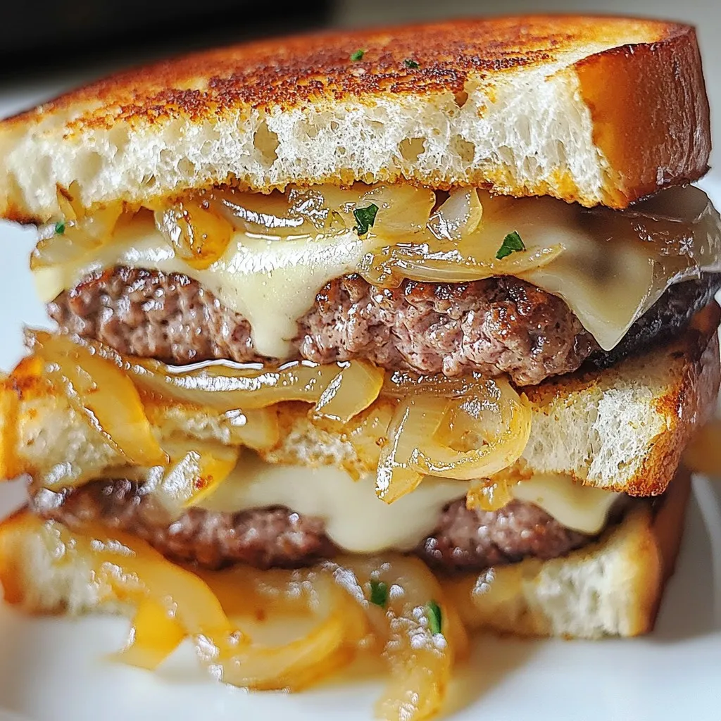 A deliciously cheesy and savory sandwich featuring ground beef patties, caramelized onions, and Swiss cheese, all grilled to perfection.