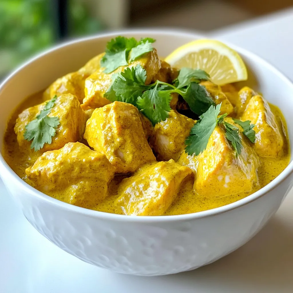 Cooking a great chicken curry starts with the right ingredients. Here’s what you need: - Chicken and Vegetables - 500g boneless chicken thighs, cut into bite-sized pieces - 1 large onion, finely chopped - 4 cloves garlic, minced - 1 tablespoon ginger, minced - 2 medium tomatoes, pureed - Spices and Seasonings - 2 tablespoons vegetable oil - 1 tablespoon curry powder - 1 teaspoon turmeric powder - 1 teaspoon garam masala - 1 teaspoon cumin seeds - Salt to taste - 1 cup coconut milk - Optional Garnishes - Fresh cilantro, chopped (for garnish) - Lemon wedges (for serving) Each ingredient plays a key role. The chicken thighs provide a tender and juicy base. The onion, garlic, and ginger create a fragrant base. The spices bring warmth and depth to the dish. Coconut milk adds creaminess and a slight sweetness. Don’t skip the garnishes! Fresh cilantro and lemon wedges brighten the dish. Enjoy these ingredients as you create your curry masterpiece! {{ingredient_image_1}} Sautéing the Base Start by heating 2 tablespoons of vegetable oil in a large pot over medium heat. Once the oil is hot, add 1 teaspoon of cumin seeds. Let them sizzle for about 30 seconds. This step brings out their flavor. Next, add 1 large onion, finely chopped. Stir the onion until it turns golden brown. This can take about 5 minutes. Now, add 4 cloves of minced garlic and 1 tablespoon of minced ginger. Cook them for 1-2 minutes until you smell their rich aroma. Cooking the Chicken After the base is ready, pour in 2 medium pureed tomatoes. Cook this mixture for about 5 minutes, stirring often. You want it to thicken slightly. Then, sprinkle in 1 tablespoon of curry powder, 1 teaspoon of turmeric powder, and some salt to taste. Mix everything well and cook for another minute. Now, add 500g of boneless chicken thighs, cut into bite-sized pieces. Stir to coat the chicken with the spices. Cook for about 5-7 minutes until the chicken starts to brown. Adding Coconut Milk and Seasoning Next, pour in 1 cup of coconut milk and stir to combine. Bring the mixture to a gentle simmer. Cover the pot and let it cook for 15-20 minutes. This will ensure the chicken cooks through and absorbs all the flavors. After this time, add 1 teaspoon of garam masala. Stir well and check if you need to adjust the seasoning. Cook for another 2 minutes before removing the pot from heat. Let it rest for a few minutes before serving. Enjoy your easy chicken curry with fresh cilantro on top and a lemon wedge on the side! Achieving Perfectly Cooked Chicken To cook chicken well, choose boneless thighs. They stay juicy and tender. Cut them into bite-sized pieces. Cook them for about 5-7 minutes until they brown. This step seals in the flavor. Ensuring Flavorful Curry Start with fresh spices. Use curry powder, turmeric, and cumin seeds for great taste. Sauté onions until golden brown. This builds a strong base. Add garlic and ginger for aroma. Don't skip the coconut milk. It adds richness and creaminess to your curry. Adjusting Spiciness Level Spice levels can change your dish. For milder curry, use less curry powder. You can also add more coconut milk to tone it down. If you like heat, try adding a pinch of cayenne pepper. Taste as you go to find your perfect balance. Serving Suggestions Serve your chicken curry in a deep bowl. This keeps the sauce from spilling. Pair it with fluffy basmati rice or warm naan. These sides soak up the tasty sauce. Garnishing Ideas Garnish with fresh cilantro for color and flavor. A lemon wedge on the side adds a zesty touch. You can also sprinkle some red chili flakes for a pop of color. Enjoy making your dish look as good as it tastes! Pro Tips Marinate for More Flavor: Allow the chicken to marinate in yogurt and spices for at least 30 minutes before cooking. This will enhance the flavor and tenderness of the chicken. Use Fresh Spices: Freshly ground spices can significantly elevate the flavor of your curry. Consider grinding whole spices like cumin and coriander seeds just before use. Balance the Flavors: Adjust the balance of spices and acidity by adding a splash of lime juice or tamarind paste towards the end of cooking to brighten up the dish. Garnish for Presentation: A simple garnish of fresh cilantro and a wedge of lemon not only enhances the dish's appearance but also adds a refreshing flavor that complements the curry. {{image_2}} You can switch the chicken for beef or tofu. For beef, choose tender cuts like sirloin. Cut it into small pieces. Cook it the same way as chicken. This will give you a rich flavor. Tofu is a great choice for a vegetarian meal. Use firm or extra-firm tofu. Cut it into cubes and sauté it until golden. Then, add it to the curry just like chicken. If you want a vegetarian curry, use vegetables instead of meat. Sweet potatoes, chickpeas, or cauliflower work well. Cut your chosen veggies into bite-sized pieces. Add them to the pot after the onions but before the coconut milk. This way, they absorb all the tasty flavors. You can swap out coconut milk for other ingredients. Almond milk or cashew cream can work in a pinch. They will change the flavor but still give you a creamy texture. If you want a lower-fat option, use low-fat milk or broth. Feel free to change up the spices in your curry. If you like it spicy, add more curry powder or chili powder. For a mild flavor, reduce the spices. You can also mix in other spices like coriander or cardamom. This will give your curry a unique twist. Experiment and find your favorite combination! Refrigeration Tips Store your chicken curry in an airtight container. It stays fresh for up to 3 days. Allow the curry to cool to room temperature before sealing. This prevents moisture buildup inside the container. Keep it on a shelf, not at the back of the fridge. The back can be colder, risking frost on your meal. Freezing Instructions If you want to keep it longer, freeze the chicken curry. Use a freezer-safe container or heavy-duty freezer bag. Make sure to re