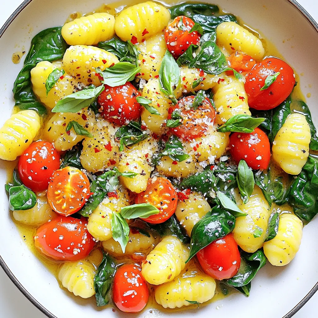 Gather these ingredients for a quick meal. I love the potato gnocchi because it has a soft texture. Unsalted butter brings a rich flavor, and garlic adds a nice kick. The cherry tomatoes give a sweet burst, while fresh spinach adds color and nutrients.