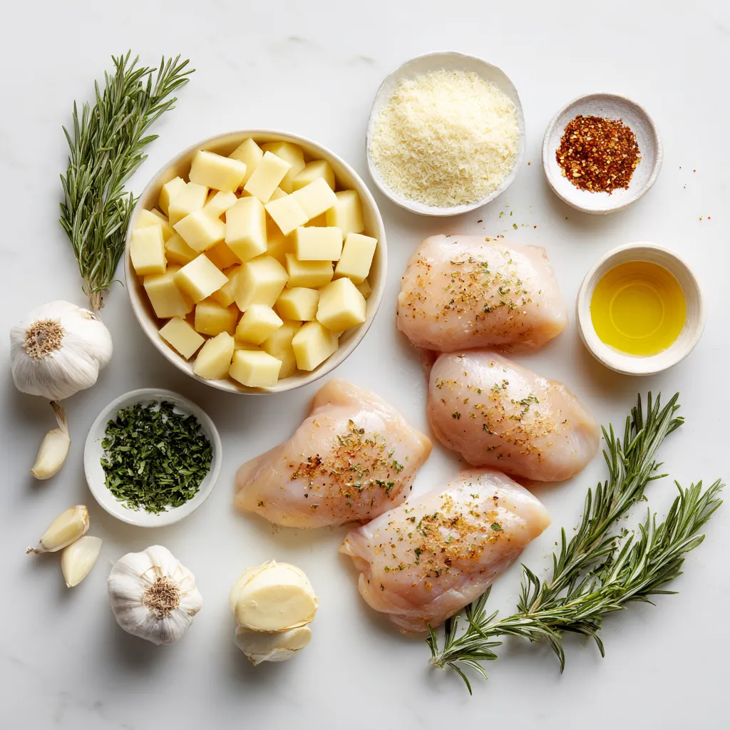 To create this delightful dish, gather these fresh ingredients. The chicken and potatoes are the stars here. The garlic adds great flavor, while Parmesan gives a rich taste. Breadcrumbs help create a crispy coat. Fresh herbs like rosemary and thyme bring a nice aroma. Don’t forget salt and pepper for seasoning.
