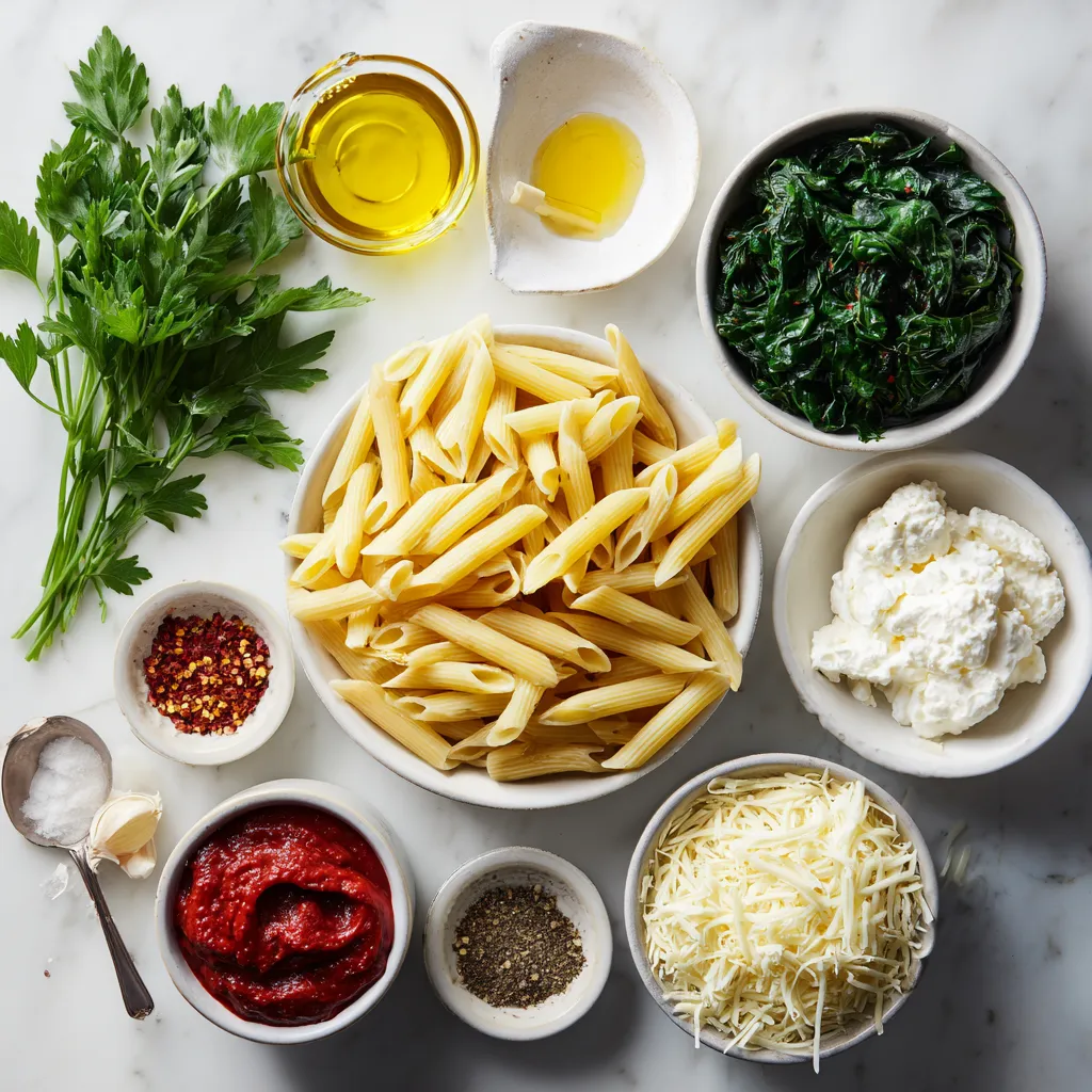 Spinach adds color and nutrients. You want about three cups of fresh spinach, chopped finely. Ricotta cheese brings creaminess to the bake. It mixes well with the pasta and marinara sauce. For a cheesy topping, use 1 1/2 cups of grated Parmesan cheese. You can save some for later to sprinkle on top.