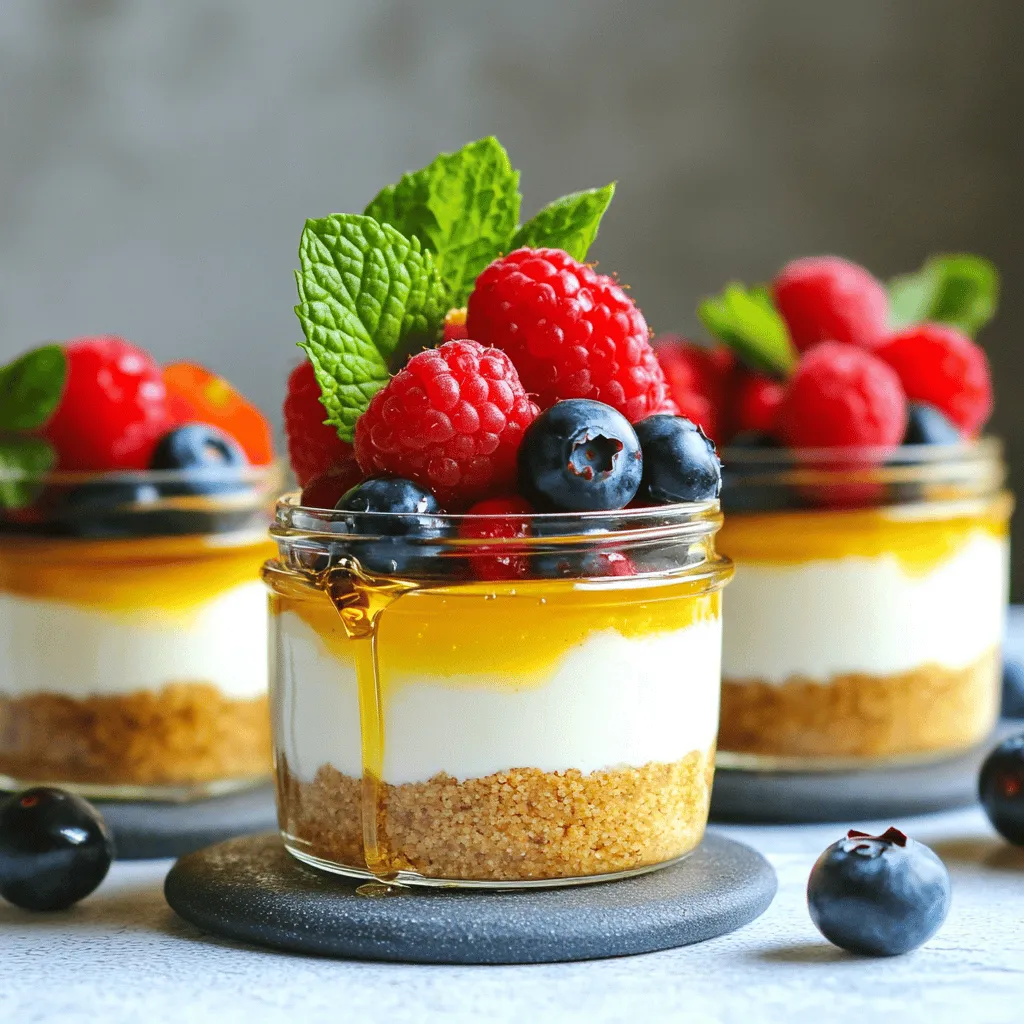 To make Greek Yogurt Cheesecake Cups, you will need: - 2 cups Greek yogurt (plain) - 8 oz cream cheese, softened - 1/2 cup honey or maple syrup (for vegan) - 1 teaspoon vanilla extract - 1 teaspoon lemon juice - 1/4 cup powdered sugar - 1 cup crushed graham crackers or almond flour (for gluten-free) - 4 tablespoons melted butter or coconut oil - Fresh berries (strawberries, blueberries, or raspberries) for topping - Fresh mint leaves for garnish (optional) These ingredients blend to create a creamy, rich cheesecake. The Greek yogurt adds tang, while the cream cheese gives it a smooth texture. For a vegan version, use: - Maple syrup instead of honey - Coconut oil instead of butter - Almond flour for the crust For gluten-free options, replace graham crackers with almond flour. This way, you can enjoy these cups no matter your dietary needs. Using high-quality ingredients makes a real difference. Fresh Greek yogurt gives a better taste and creaminess. Choose full-fat cream cheese for a rich flavor. When you use pure vanilla extract, it enhances the dessert’s aroma. Fresh berries should be ripe and vibrant to brighten your cheesecake cups. Quality ingredients lead to a more delicious treat everyone will love. To make the crust, grab a mixing bowl. Combine 1 cup of crushed graham crackers or almond flour with 4 tablespoons of melted butter or coconut oil. Mix it well. You want every crumb to be coated in butter. This gives it a rich taste. Next, take serving cups or small jars. Divide the mixture evenly among them. Press it firmly to create an even layer at the bottom. This step is key for a solid base. Once done, place the cups in the fridge. Let them chill while you prepare the filling. Using a large bowl, take 8 ounces of softened cream cheese. Blend it with a hand mixer until it's smooth. Make sure there are no lumps. Now, add 2 cups of plain Greek yogurt. Then mix in 1/2 cup of honey or maple syrup, 1 teaspoon of vanilla extract, 1 teaspoon of lemon juice, and 1/4 cup of powdered sugar. Beat this mixture until it becomes creamy and fully combined. This is the heart of your cheesecake cups. Remove the crust cups from the fridge. Spoon the cheesecake filling over the crusts. Smooth out the tops for a nice finish. Cover the cups and refrigerate them for at least 2 to 4 hours. The longer they chill, the better the flavor will be. Before serving, top each cup with fresh berries like strawberries, blueberries, or raspberries. You can add a mint leaf for a nice touch. Enjoy your creamy delight! To get the best cheesecake, you need smooth ingredients. Start by softening the cream cheese. This makes it mix well with the Greek yogurt. Use a hand mixer to blend until you have a creamy texture. If the mixture is too thick, add a splash of milk. This helps it become smoother and lighter. You can make these cups your own! Try different flavors by adding zest from lemons or limes. You can also mix in fruit purees, like strawberry or raspberry, for a fruity twist. For toppings, fresh berries are great. You can also use crushed nuts or a drizzle of chocolate. Mint leaves add a nice touch too! Be careful not to over-mix the filling. This can make it too airy and change the texture. Watch how much sweetener you add. Too much can overpower the taste. Make sure to chill the cups long enough. If you skip this step, the cheesecake may not set well. Take your time and enjoy the process! {{image_2}} You can play with flavors by using different Greek yogurt. Try vanilla or lemon for a zestier taste. Strawberry Greek yogurt adds a nice fruity twist. You can even use honey-flavored yogurt for extra sweetness. Each choice changes the flavor profile while keeping it creamy. Mix and match to find your favorite! While crushed graham crackers are classic, you can switch it up! Almond flour makes a great gluten-free crust. Try crushed cookies or even oats for a unique texture. If you want a nutty taste, use ground nuts like pecans. You can also use coconut flour for a tropical hint. The crust is your canvas—be creative! Toppings can change with the seasons. In spring, fresh strawberries or cherries are bright and tasty. Summer calls for blueberries or raspberries to keep it cool. In fall, diced apples with cinnamon add warmth. Winter can be cozy with pomegranate seeds or citrus zest. Don't forget a sprig of mint for a fresh touch. Each season brings new flavors to enjoy! To keep your Greek yogurt cheesecake cups fresh, store them in the fridge. Use airtight containers or cover each cup with plastic wrap. This helps prevent the cheesecake from absorbing any odors. Make sure to keep the cups away from strong-smelling foods. This way, your dessert stays tasty and fresh. If you want to save some cheesecake cups for later, you can freeze them. First, let the cups chill in the fridge until set. Then, wrap each cup tightly in plastic wrap. Place them in a freezer-safe bag or container. You can freeze them for up to three months. To enjoy, thaw them in the fridge overnight before serving. These cheesecake cups will stay fresh in the fridge for about 4 to 5 days. After that, the texture and taste may change. Always check for any signs of spoilage. If they look or smell off, it’s best to toss them. Enjoy your treat while it's at its best! Yes, you can use low-fat Greek yogurt. It will still taste great. The texture may be a bit lighter, but it will work. Just make sure it is plain. This option keeps it creamy without adding too much fat. The cheesecake cups are set when they feel firm to the touch. They should not jiggle when you move them. If they seem soft in the middle, give them more time in the fridge. I recommend chilling them for at least 2-4 hours. The longer they chill, the better the flavor gets. Absolutely! These cheesecake cups are perfect for making ahead of time. You can prepare them up to two days in advance. Just store them in the fridge until you are ready to serve. This makes them a great option for parties