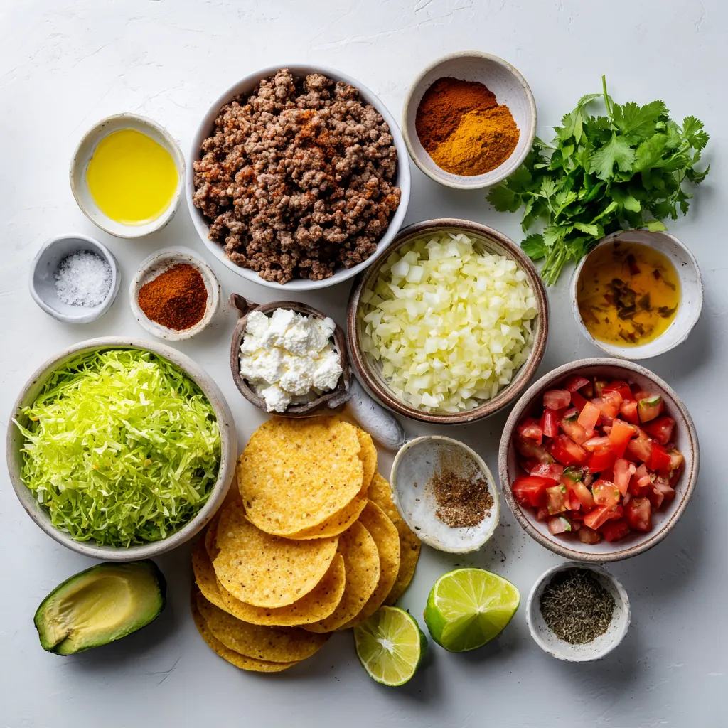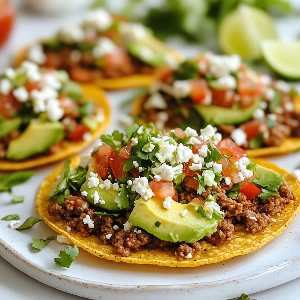For tasty ground beef tostadas, you need: - 1 lb ground beef - 1 tablespoon olive oil - 1 small onion, finely chopped - 2 garlic cloves, minced - 1 teaspoon ground cumin - 1 teaspoon chili powder - 1 teaspoon smoked paprika - Salt and pepper to taste - 8 tostada shells - 1 cup refried beans (canned or homemade) These ingredients create a savory base. The ground beef gives the tostadas their heartiness. Each spice adds depth to the flavor. You can elevate your tostadas with these toppings: - 1 cup shredded lettuce - 1 cup diced tomatoes - 1 avocado, sliced - 1/2 cup crumbled queso fresco - Fresh cilantro for garnish - Lime wedges for serving These toppings add freshness and color. They also bring different textures. Avocado lends creaminess, while cilantro adds a burst of flavor. Serve your tostadas with these sides for a complete meal: - Mexican rice - Black beans - Corn salad - Chips and salsa These sides complement the tostadas well. They provide more flavors and make your meal more filling. Enjoy your tasty feast! {{ingredient_image_1}} Start by heating one tablespoon of olive oil in a large skillet over medium heat. Add one small, finely chopped onion. Sauté it until it turns soft and clear, about three minutes. Next, add two minced garlic cloves and cook for one more minute. This will make your kitchen smell great. Now, add one pound of ground beef. Use a wooden spoon to break it into smaller pieces. Cook the beef until it is brown, which should take about five to seven minutes. Season it with one teaspoon each of ground cumin, chili powder, and smoked paprika. Add salt and pepper to taste. Mix everything well and let it cook for another two to three minutes. This will help the flavors blend together. While the beef cooks, it’s time to prepare the tostada shells. Follow the package instructions. You usually need to bake or fry them until they are crispy. Crispy shells hold the toppings well and add a nice crunch. If you want to make homemade tostadas, simply fry corn tortillas in hot oil until they turn golden and crunchy. Let them cool on paper towels to remove excess oil. Now comes the fun part: assembling the tostadas. First, take each crispy tostada shell and spread a layer of refried beans on top. You can use one cup of refried beans, whether canned or homemade. Next, add a generous amount of the seasoned ground beef mixture on top of the beans. Now, it’s time to pile on the fresh toppings. Add shredded lettuce, diced tomatoes, and avocado slices. Finish with half a cup of crumbled queso fresco. This adds creaminess and a nice salty flavor. Finally, sprinkle fresh cilantro on top. Serve your tostadas with lime wedges for squeezing over them. This adds a fresh, tangy touch that brightens up every bite. Enjoy your flavorful and easy ground beef tostadas! Choose 80/20 ground beef for a juicy and tasty result. This means 80% meat and 20% fat. The fat gives flavor and keeps the beef moist. Look for bright red color and a fresh smell. Avoid any beef that looks brown or smells off. You can also pick leaner beef, but it may be less juicy. To get crispy tostadas, bake or fry them until golden. If you bake, preheat your oven to 400°F (200°C). Lay the tostada shells flat on a baking sheet. Bake for about 5-7 minutes. If frying, heat oil in a pan. Fry each shell for about 30 seconds on each side. Let them cool on paper towels to stay crisp. Add extra flavor to the beef by trying different spices. You can mix in some oregano or cayenne pepper for a kick. If you like it mild, stick to cumin and paprika. Taste as you cook to find your perfect mix. Fresh lime juice on top can brighten all the flavors. Experiment with toppings like jalapeños or hot sauce for more heat. Pro Tips Use Fresh Ingredients: Fresh produce enhances the flavor of your tostadas. Always opt for ripe avocados and fresh herbs for the best taste. Customize Your Spice Level: Adjust the chili powder to your preferred heat level. You can also add fresh jalapeños for an extra kick! Perfectly Crisp Tostadas: For the crispiest tostadas, bake them in the oven until golden brown. This method avoids excess oil and maintains crunch. Meal Prep Tip: Prepare the seasoned ground beef and refried beans ahead of time. This allows for quick assembly during busy weeknights. {{image_2}} You can swap ground beef for plant-based options. Use lentils, black beans, or crumbled tofu. These options give great texture and flavor. For lentils, cook them with spices like cumin and chili powder. This adds depth and keeps the taste rich. Black beans can be mashed or left whole for a different bite. Tofu needs seasoning, so be sure to marinate it before cooking for more flavor. Toppings can change your tostadas completely. You can add sliced jalapeños for a kick. If you want crunch, try radishes or pickled onions. For a refreshing twist, use cucumber or corn. You can also add sour cream or Greek yogurt for creaminess. Don't forget about cheese; shredded cheddar or pepper jack works well too. You can mix and match toppings based on what you like. This way, every tostada can be unique. If you enjoy heat, there are many ways to spice up your tostadas. Start with adding diced jalapeños or serrano peppers to the beef mix. For more flavor, try using a spicy salsa on top. You can also drizzle hot sauce over your toppings. Experiment with spicy seasonings like cayenne or chipotle powder in the beef. If you want a real kick, consider adding a layer of spicy guacamole. This will make your tostadas sing with heat! You can store leftover ground beef tostadas in the fridge. Place them in an airtight container. They stay fresh for up to three days. When ready to eat, remove the toppings. This keeps them crisp. Reheat the beef in a skillet over medium heat. Heat it for about five minutes. You can also use the microwave. Just cover it and heat for one to two minutes. Freezing tostadas is a great way to save them. Place the cooked beef in a container. You can al