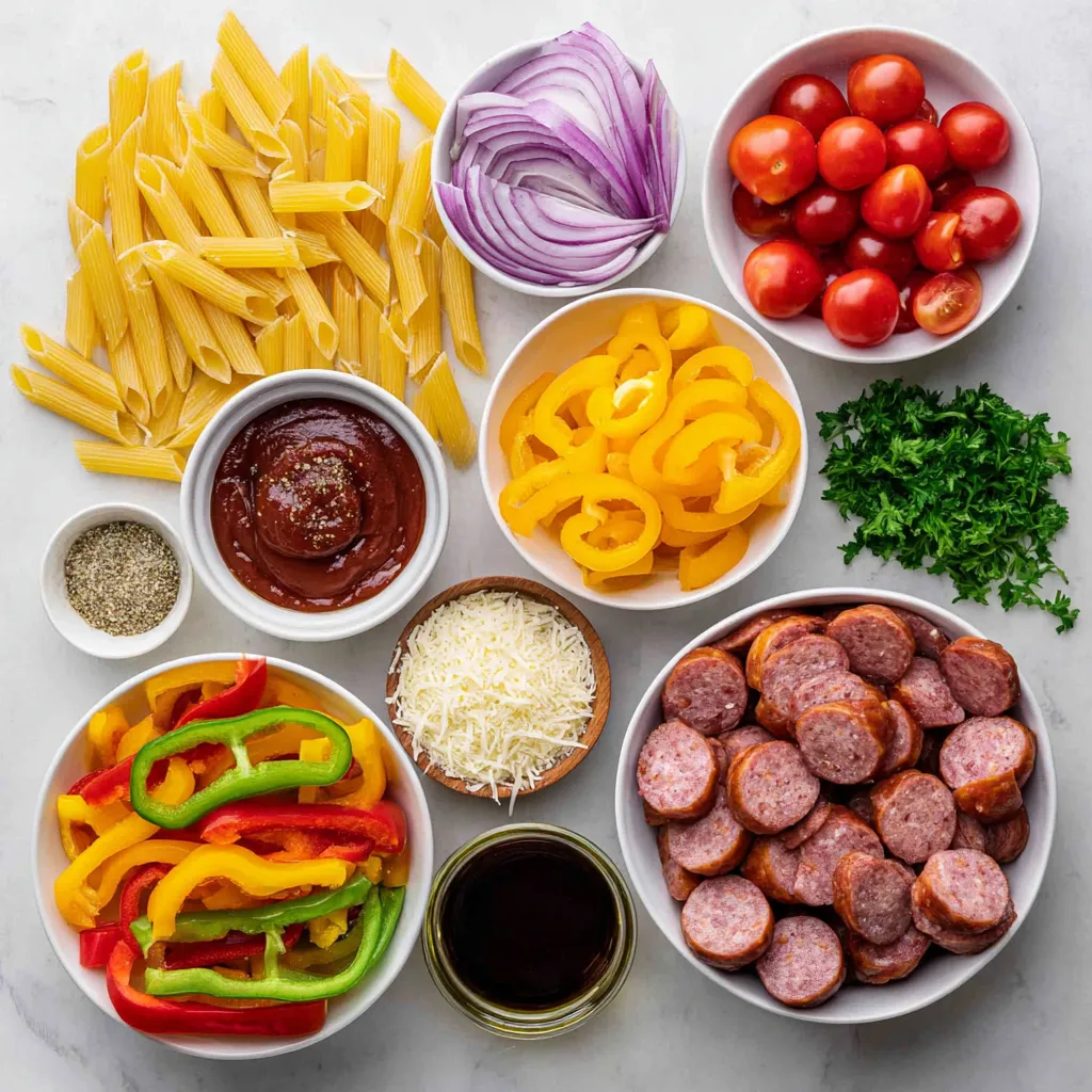 Gathering the right ingredients is key to this dish. Start with 8 ounces of penne pasta. It cooks up firm and holds onto the sauce well. Next, grab 1 pound of smoked sausage. This adds rich flavor and a nice bite.