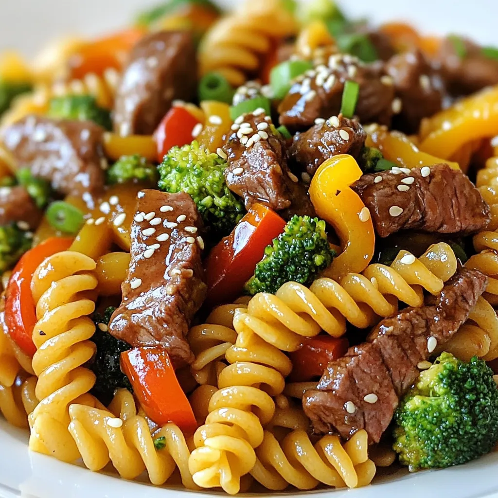 - 8 oz rotini pasta - 1 lb flank steak, sliced thin against the grain - 1/4 cup honey - 3 cloves garlic, minced - 1/4 cup soy sauce (low sodium) - 1 tablespoon sesame oil - 1 teaspoon freshly grated ginger - 1 bell pepper, sliced (any color) - 1 cup broccoli florets - Chopped green onions, for garnish - Sesame seeds, for garnish Gather these fresh ingredients before you start cooking. The rotini pasta is the base of this dish. Its twisty shape holds onto the sauce well. The flank steak offers rich flavor and tender bites. Honey brings a sweet touch that balances the savory notes. The marinade shines with garlic, soy sauce, sesame oil, and ginger. This mix adds depth to the steak. Marinating it helps the flavors soak in. For the vegetables, bell pepper adds crunch and color. Broccoli florets bring a healthy boost. Finally, green onions and sesame seeds make great garnishes. They add flavor and visual appeal to your meal. With these ingredients, you create a dish that is both tasty and pleasing. Enjoy cooking this delightful meal! {{ingredient_image_1}} To start, bring a large pot of water to a boil. Add salt to the water. Salt helps the pasta taste better. Once boiling, add 8 oz of rotini pasta. Cook it until it’s al dente. This usually takes about 8-10 minutes. After that, drain the pasta and set it aside. Next, let’s make the marinade. In a bowl, mix together 1/4 cup honey, 3 minced cloves of garlic, 1/4 cup low-sodium soy sauce, 1 tablespoon sesame oil, and 1 teaspoon grated ginger. This mix gives the steak a sweet and savory flavor. Place 1 lb of thinly sliced flank steak in a resealable bag. Pour the marinade over the steak. Make sure it’s well-coated. Let it marinate for at least 30 minutes. For stronger flavor, marinate up to 2 hours in the fridge. While the steak marinates, let’s sauté the veggies. Heat 2 tablespoons of olive oil in a large skillet over medium-high heat. Add sliced bell pepper and 1 cup of broccoli florets. Sauté for about 3-4 minutes. You want them to soften but still be crisp. Remove them from the skillet and set aside. Now, it’s time to cook the steak. In the same skillet, add the marinated steak and the leftover marinade. Cook for about 4-6 minutes. Stir it continuously for even cooking. Check for your desired doneness. For medium-rare, aim for an internal temperature of 135°F. Once the steak is done, add the sautéed vegetables back to the skillet. Toss in the cooked rotini. Mix everything well, making sure the pasta gets coated with the honey garlic sauce. Season with salt and pepper to taste. For serving, divide the Honey Garlic Steak Rotini into plates or bowls. To make it look nice, garnish with chopped green onions and sesame seeds. This adds a pop of color and extra crunch. Enjoy your meal! To enhance the flavor of the marinade, you can add a splash of rice vinegar or a pinch of red pepper flakes for a little kick. These extras add depth and balance to the sweet and savory notes. Marinating the steak is key. I recommend marinating for at least 30 minutes but try to go for 2 hours if you can. This lets the flavors soak in well and makes the meat tender. Use a heavy, non-stick skillet for best results. This type of pan helps distribute heat evenly and prevents sticking. When sautéing, keep an eye on the heat. Start at medium and adjust as needed. Stir often to avoid burning. If things start to brown too quickly, lower the heat a bit. It’s all about getting that perfect golden color without char. Feel free to customize your dish with extra vegetables. Snap peas, carrots, or zucchini can brighten it up. You can also adjust the sweetness by adding more honey or a splash of soy sauce for saltiness. If you want more heat, a dash of chili sauce or fresh jalapeños can elevate the dish. Enjoy making it your own! Pro Tips Rest the Steak: After cooking, let the steak rest for a few minutes before slicing. This allows the juices to redistribute, resulting in a more tender and flavorful meat. Customize the Veggies: Feel free to swap the bell peppers and broccoli for your favorite vegetables. Zucchini, snap peas, or carrots would also work well in this dish. Marination Time: For the best flavor, marinate the steak for at least 1 hour, but if time allows, letting it sit overnight in the fridge will enhance the taste even more. Leftover Storage: Store any leftovers in an airtight container in the fridge for up to 3 days. Reheat gently to avoid overcooking the steak. {{image_2}} You can easily swap out flank steak for chicken. Just cut the chicken into thin strips. The marinade works well with chicken, too. Cook it until it’s no longer pink, just like the steak. If you’re looking for plant-based options, try tofu. Firm tofu absorbs flavors well. Press it to remove extra water, then marinate it like the steak. Sauté the tofu until it’s golden brown. This gives a nice texture. Rotini is great, but you can use other types of pasta. Whole grain rotini adds fiber and a nutty flavor. Gluten-free rotini is also a good choice for those with dietary needs. Other pasta shapes like penne or fusilli can work too. Each shape holds sauce differently, so choose what you like best. Want to add depth? Try some spices like crushed red pepper for heat or smoked paprika for a rich flavor. A splash of rice vinegar can brighten the dish. You can also add citrus elements. Squeeze fresh lime or lemon juice over the dish before serving. This adds a nice zing and fresh taste. To keep your Honey Garlic Steak Rotini fresh, store leftovers in the fridge. Use airtight containers to prevent moisture loss. This keeps your pasta tasty for up to three days. Make sure the pasta cools down before sealing. This helps avoid condensation inside the container. To reheat your pasta, use a skillet over low heat. Add a splash of water or broth to keep it moist. Stir gently to warm it up evenly. If you use a microwave, cover it loosely to avoid drying out. Aim for just a few minutes to main