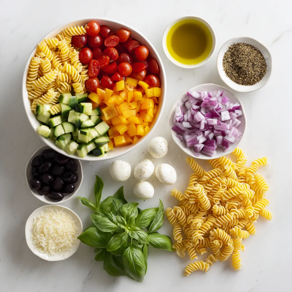 These ingredients work together to create a colorful and flavorful dish. The pasta acts as a base, while the veggies add crunch and freshness. Mozzarella and olives give it a nice, savory touch.