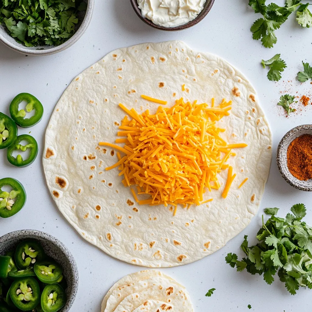 • Lay the flour tortilla on a clean surface. Spread the cheese mixture evenly across the tortilla, leaving about half an inch around the edges.