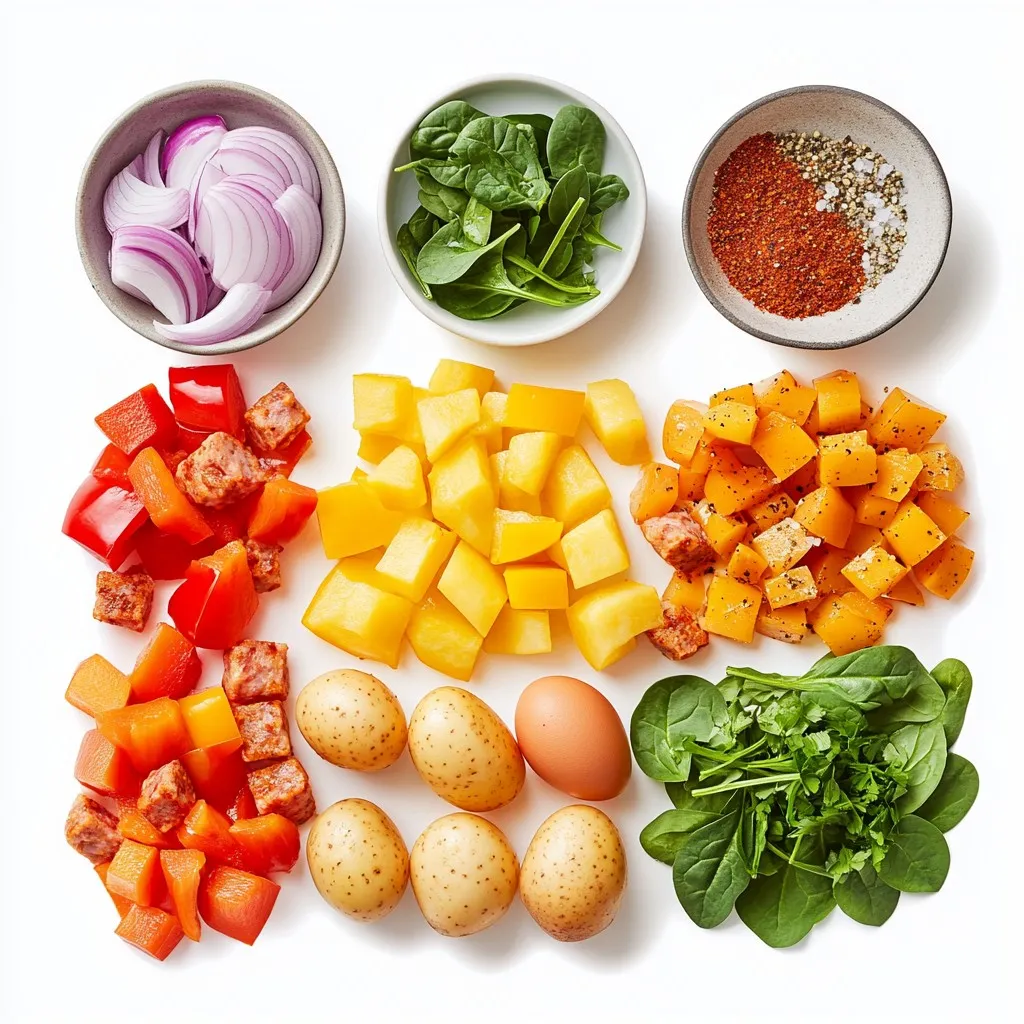 Each ingredient in this loaded breakfast hash plays a key role. The russet potatoes make a hearty base. Their texture adds a nice crunch. The bell pepper adds color and sweetness. Choosing any color will work well. The small red onion gives a mild flavor that mixes perfectly. Baby spinach contributes vitamins and a fresh taste.