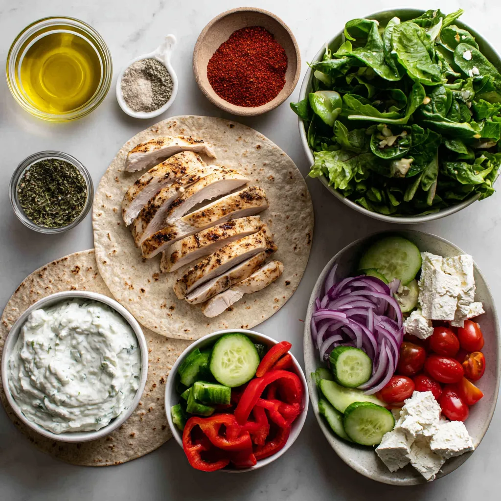 – Fresh vegetables and toppings: You will need 1 cup mixed greens, 1 cucumber (sliced), 1 red bell pepper (sliced), 1/2 cup cherry tomatoes (halved), 1/2 red onion (thinly sliced), and 1/2 cup feta cheese (crumbled). These add crunch and color to your wraps.