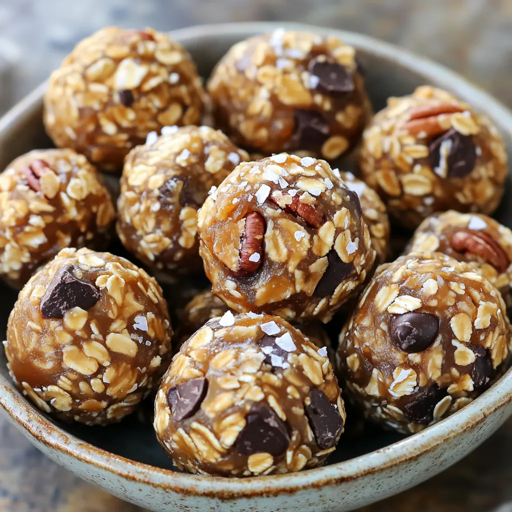 These ingredients are simple but pack a punch! Medjool dates give a sweet caramel taste. Rolled oats add great texture and fiber. Almond butter or any nut butter brings creaminess and healthy fats. Maple syrup adds a natural sweetness. Vanilla extract enhances all the flavors. Sea salt balances the sweetness and gives that salted caramel touch. Dark chocolate chips add a fun twist, while pecans or your favorite nuts provide crunch.