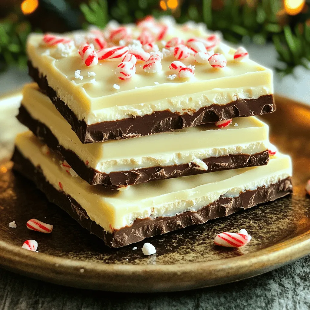 - 2 cups white chocolate chips - 1 cup dark chocolate chips - 1 tablespoon coconut oil - 1/2 teaspoon peppermint extract - 1/2 cup crushed peppermint candies (plus more for garnish) - 1/4 teaspoon sea salt - 1 cup graham cracker crumbs - 1/4 cup unsweetened cocoa powder You need good-quality white chocolate chips for the best taste. I love using dark chocolate chips that melt well. Coconut oil makes the chocolate smooth and gives a nice shine. Peppermint extract adds that fresh, minty flavor. You can find crushed peppermint candies at most stores. Sea salt brings out the sweetness and makes the flavors pop. Graham cracker crumbs form a crunchy base. Unsweetened cocoa powder adds a rich touch to the bars. This combination gives you a sweet and salty treat that is hard to resist. - Alternatives for white chocolate chips: You can use vanilla flavored chips if you want. - Options for dairy-free versions: Look for dairy-free chocolate chips made from coconut or almond milk. - Variations on peppermint extract: Use vanilla extract for a different flavor or leave it out if you prefer. These substitutions allow you to enjoy this recipe no matter your dietary needs. How to prepare the baking dish Start by lining an 8x8 inch square baking dish with parchment paper. Make sure to leave some paper overhanging. This makes it easy to lift the bars out later. Melting chocolate method Next, take a microwave-safe bowl and add the dark chocolate chips and coconut oil. Heat the mixture in 30-second intervals. Stir it after each interval until it is fully melted and smooth. Creating the dark chocolate base Now, pour the melted dark chocolate into your prepared dish. Spread it evenly using a spatula. Adding the graham cracker crust Sprinkle the graham cracker crumbs over the melted chocolate. Press them down gently to form a nice layer. Place the dish in the freezer for about 15 minutes to let it set. Combining layers with white chocolate In a new microwave-safe bowl, melt the white chocolate chips the same way. Once melted, stir in the peppermint extract and crushed peppermint candies. After the dark chocolate layer has set, pour this white chocolate mix on top. Use a spatula to spread it evenly. Adding finishing touches before chilling While the white chocolate is still soft, sprinkle a pinch of sea salt and more crushed peppermint candies on top. This adds a fun crunch and a burst of flavor. Place the dish back in the freezer for at least 30 minutes. Wait until the bark is completely firm before cutting. To avoid seized chocolate, always use dry bowls. Water can ruin the chocolate. Melt the chocolate in short bursts. Heat it for 30 seconds, then stir. Repeat until smooth. For a nice texture, add one tablespoon of coconut oil. This helps thin the chocolate and keeps it silky. Chill the dark chocolate layer for about 15 minutes. You want it set but still soft. For the white layer, chill for at least 30 minutes. This makes cutting easier. Look for bars that feel firm to the touch. If they are soft or sticky, let them chill longer. For serving, arrange the bars on a festive plate. You can use whole peppermint candies to add color. A sprig of mint also looks nice. For a fun touch, sprinkle crushed candies on top. This adds a pop of color and flavor. {{image_2}} You can boost flavor by adding crushed nuts or other candies. Think walnuts, almonds, or even toffee bits. They add crunch and taste. If you like chocolate mint bark, swap the white chocolate for dark chocolate. Use mint chocolate chips for a fresh twist. This change makes it rich and minty. To make this recipe vegan, use dairy-free chocolate chips. They taste great and work well. For a gluten-free option, choose gluten-free graham crackers. You can also use sweeteners like maple syrup or agave. These give a different taste and cut down on sugar. You can adapt these bars for different holidays. Use colored sprinkles for Easter or red and green candies for Christmas. You can also add seasonal ingredients like pumpkin spice in fall. This makes the treat festive and fun for any time of year. To keep your no bake white chocolate peppermint bark bars fresh, store them in the refrigerator. Use an airtight container to keep out moisture and odors. If you don’t have one, wrap them tightly in plastic wrap. This will help maintain their taste and texture. These bars last about two weeks in the fridge. After that, their taste and texture may change. Signs that the bars have gone bad include a strange smell, discoloration, or a change in texture. If you notice any of these signs, it’s best to toss them out. To freeze the bark, cut it into squares first. Place the pieces in a single layer on a baking sheet and freeze them for about an hour. Once frozen, transfer the bars to a freezer-safe bag. Squeeze out as much air as you can before sealing. This helps avoid freezer burn. To thaw, move the bars to the fridge for a few hours or overnight. Avoid thawing at room temperature to keep their texture nice. Enjoy your festive treat anytime you crave a sweet, minty bite! Can I use other types of chocolate? Yes, you can use dark or milk chocolate. Each will give a different flavor. Dark chocolate adds richness, while milk chocolate offers sweetness. You might want to adjust the peppermint extract to balance the taste. How do I prevent the bars from being too sweet? To cut the sweetness, use dark chocolate with a higher cocoa content. Adding a pinch of sea salt helps too. It brings out the flavors without adding more sugar. You can also use less white chocolate or mix in some nuts for texture. What to do if the chocolate doesn't set? If the chocolate is too soft, it may need more chill time. Place it in the freezer for an extra 10 to 15 minutes. If it still doesn’t set, it might be too warm when poured. Start over with cooler melted chocolate. How can I fix chocolate that has seized? If your chocolate seizes, add a small amount of coconut oil. Heat gently until it melts. 