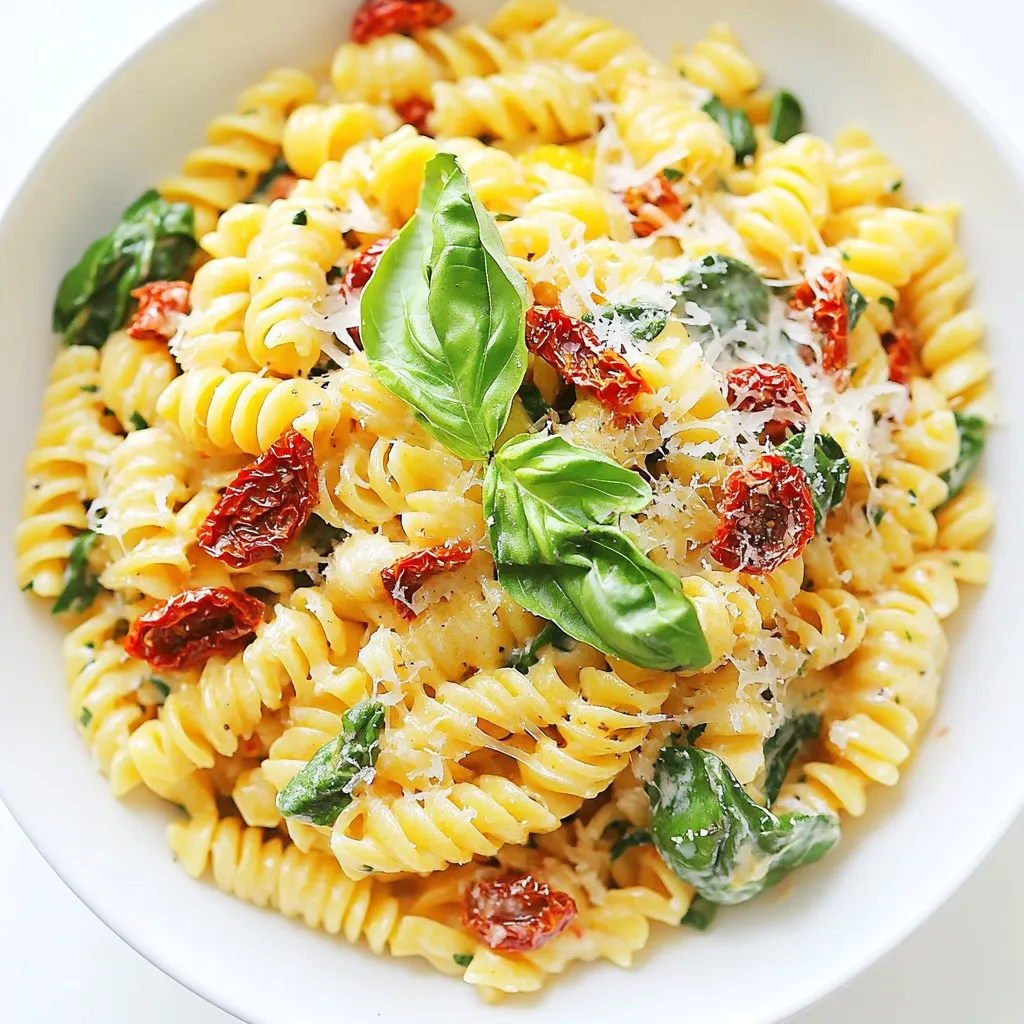 Here is what you need for No-Chop Sun-Dried Tomato Pasta. These ingredients come together to make a creamy, flavorful dish. - 8 oz pasta (your choice, such as rotini or fettuccine) - 1 cup sun-dried tomatoes in olive oil, drained and chopped (or leave whole for texture) - 1/2 cup heavy cream - 1/2 cup grated Parmesan cheese - 2 cloves garlic, minced - 1 tsp red pepper flakes (adjust according to spice preference) - 2 cups baby spinach - 2 tablespoons olive oil - Salt and pepper to taste - Fresh basil leaves for garnish (optional) This list includes rich flavors and textures, making the dish feel gourmet. Each ingredient plays a role. The sun-dried tomatoes add sweetness. The cream and cheese create the sauce's rich base. Spinach adds color and nutrients. You can mix and match the pasta type to your liking. Enjoy experimenting with this simple yet elegant meal! {{ingredient_image_1}} 1. Start by filling a large pot with water. Add a pinch of salt. 2. Bring the water to a rolling boil over high heat. 3. Once boiling, add 8 oz of your favorite pasta, like rotini or fettuccine. 4. Cook the pasta according to the package instructions, usually around 8-10 minutes. 5. When the pasta is al dente, reserve 1 cup of the pasta water. 6. Drain the pasta in a colander and set it aside. 1. In the same pot, add 2 tablespoons of olive oil over medium heat. 2. Add 2 cloves of minced garlic and sauté for about 1 minute. 3. The garlic should smell good but not brown. 4. Stir in 1 cup of sun-dried tomatoes and 1 teaspoon of red pepper flakes. 5. Cook this mix for about 2 minutes to let the flavors blend. 6. Pour in ½ cup of heavy cream and bring it to a gentle simmer. 7. Cook for another 2-3 minutes, stirring often until the sauce thickens slightly. 1. Lower the heat and add the drained pasta back into the pot. 2. Sprinkle in ½ cup of grated Parmesan cheese and toss well. 3. Gradually add the reserved pasta water until the sauce reaches your desired thickness. 4. Fold in 2 cups of baby spinach, letting it wilt into the pasta. 5. Season with salt and pepper to taste, mixing well. 6. Serve right away, garnished with fresh basil leaves if you like. Using reserved pasta water is key. It helps to create a creamy sauce. The starchy water adds smoothness. Start by adding a little at a time. Stir it in until the sauce coats the pasta. Adjust spice levels to suit your taste. If you like it spicy, add more red pepper flakes. For less heat, start with half a teaspoon. Taste as you go to find your perfect balance. You can easily make this dish dairy-free. Substitute heavy cream with coconut cream. Use nutritional yeast instead of Parmesan for a cheesy flavor. For gluten-free options, choose gluten-free pasta. Many brands offer great alternatives. Make sure to check the label for any allergens. Garnishing with basil makes your dish pop. Fresh basil adds color and flavor. Just sprinkle a few leaves on top before serving. For serving, use a large bowl. This allows everyone to help themselves. You can also pair it with a side salad for a complete meal. Pro Tips Perfect Pasta Texture: To achieve the best texture, cook the pasta until al dente, as it will continue to cook slightly when mixed with the sauce. Sun-Dried Tomato Variety: Use sun-dried tomatoes packed in oil for added flavor, but if you prefer a more intense taste, consider using dry sun-dried tomatoes that you can rehydrate. Adjusting Creaminess: If you prefer a creamier sauce, add more heavy cream or a splash of reserved pasta water to achieve your desired consistency. Fresh Spinach Substitute: If fresh spinach isn’t available, you can use kale or arugula as a delicious alternative, adding them at the same stage to wilt them into the dish. {{image_2}} You can boost the dish by adding protein. Chicken, shrimp, or tofu work great. If you choose chicken, use grilled or sautéed pieces. For shrimp, just cook them until pink and toss them in. If you prefer tofu, use firm tofu and sauté it until golden brown. Each option adds flavor and makes the meal heartier. You can add more veggies for texture and flavor. Try bell peppers for sweetness or mushrooms for earthiness. Zucchini or broccoli adds a nice crunch, too. You can also toss in peas or asparagus for a pop of color. Just make sure to cook them slightly before mixing them into the pasta. Feel free to explore different sauces. Instead of heavy cream, you might try a light tomato sauce. A basil pesto can give it a fresh twist. For a spicy kick, consider a garlic-infused olive oil. Each sauce changes the flavor, making the dish exciting and new every time! To keep your No-Chop Sun-Dried Tomato Pasta fresh, store any leftovers in an airtight container. Make sure to let the pasta cool down first. Place the container in the fridge. This method helps to keep the flavors intact. Leftovers can last up to three days in the refrigerator. When you are ready to enjoy the leftovers, reheat them gently. You can use a pan on low heat. Add a splash of water or extra cream to help keep the sauce smooth. Stir often to prevent sticking. If you prefer, you can microwave the pasta in a bowl, covering it to keep moisture in. Heat it for 1-2 minutes, then check if it’s warm enough. If you want to store the pasta for longer, freezing is a great option. Portion the pasta into freezer-safe bags or containers. Make sure to remove as much air as possible to prevent freezer burn. You can freeze it for up to three months. To thaw, place it in the fridge overnight. Reheat it gently as mentioned before. You can store No-Chop Sun-Dried Tomato Pasta in the fridge for up to 3 days. Place it in an airtight container to keep it fresh. The flavors will blend more as it sits, so it tastes even better the next day! Yes, you can make this dish ahead of time. Cook the pasta and sauce separately. Store each in different containers in the fridge. When ready to eat, simply heat the sauce and mix it with the pasta. This keeps everything fresh and tasty!