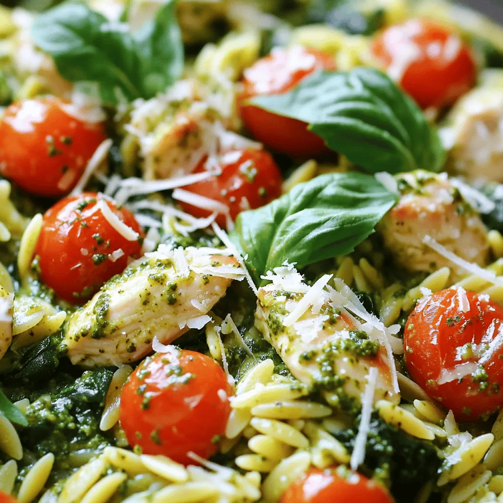 - 2 tablespoons olive oil - 1 pound boneless, skinless chicken breasts, diced - Salt and pepper to taste - 1 small onion, finely chopped - 3 cloves garlic, minced - 1 cup orzo pasta - 4 cups chicken broth - 1 cup heavy cream - 1/2 cup pesto (store-bought or homemade) - 1 cup cherry tomatoes, halved - 1 cup spinach, roughly chopped - 1/2 cup grated Parmesan cheese - Fresh basil leaves for garnish - Olive Oil: This is your cooking fat. It adds flavor and helps cook the chicken. - Chicken Breasts: Boneless and skinless chicken is easy to cook and very tender. - Orzo Pasta: This small pasta cooks quickly and absorbs flavors well. - Heavy Cream: This makes the dish rich and creamy, adding a nice texture. - Pesto: This sauce gives your dish a fresh, herby taste. You can use store-bought or make your own. - Spinach: This adds color and nutrition. It wilts down but keeps its flavor. - Parmesan Cheese: This cheese adds a salty kick and enhances the dish's creaminess. - Olive Oil: You can use canola oil or butter if you prefer. - Chicken: Swap chicken for tofu or chickpeas for a vegetarian dish. - Orzo: Try small pasta shapes like rice or quinoa for a different texture. - Heavy Cream: Use coconut cream or a milk alternative for a lighter option. - Pesto: If you want a different flavor, try sun-dried tomato spread instead. - Spinach: Kale or Swiss chard can also work well in this dish. Start by gathering all your ingredients. You need: - 2 tablespoons olive oil - 1 pound boneless, skinless chicken breasts, diced - Salt and pepper to taste - 1 small onion, finely chopped - 3 cloves garlic, minced - 1 cup orzo pasta - 4 cups chicken broth - 1 cup heavy cream - 1/2 cup pesto - 1 cup cherry tomatoes, halved - 1 cup spinach, roughly chopped - 1/2 cup grated Parmesan cheese - Fresh basil leaves for garnish Make sure to wash your veggies and slice them. This makes cooking faster and easier. In a large pot, heat the olive oil on medium-high. Add the diced chicken. Season it with salt and pepper. Cook until it is browned and no longer pink, about 5 to 7 minutes. Once done, take the chicken out and set it aside. In the same pot, toss in the chopped onion and minced garlic. Sauté them for 2 to 3 minutes until the onion is soft and clear. This adds great flavor to your dish. Next, add the orzo pasta to the pot. Stir it for a minute until it looks a bit toasted. Then, pour in the chicken broth. Bring it to a boil and lower the heat to a simmer. Cook for about 8 to 10 minutes, stirring now and then, until the orzo is just right. Once the orzo is cooked, stir in the heavy cream and pesto until everything blends well. Add the chicken back to the pot along with the cherry tomatoes, spinach, and grated Parmesan cheese. Mix it all until the spinach wilts and everything is warm. Taste your dish. If needed, add more salt and pepper. Serve hot, topped with fresh basil leaves and extra Parmesan if you like. Enjoy your creamy pesto chicken orzo! To get that rich creaminess, use heavy cream. It blends well with pesto. Stir it in slowly to keep it smooth. If you want a lighter version, try half-and-half. This keeps the dish creamy but reduces fat. Cook the orzo until it is al dente, about 8-10 minutes. Stir it often to prevent sticking. If overcooked, it can turn mushy. Check the pasta a minute early. This way, you ensure the perfect bite. Add vegetables like spinach and cherry tomatoes towards the end. This helps them stay bright and fresh. Cook them just enough to wilt or soften. For extra flavor, sauté garlic with the onions first. This adds depth without overpowering the dish. {{image_2}} You can easily make this dish gluten-free. Swap the orzo for gluten-free pasta. Many brands offer options that work well. Just check the cooking time on the package. You might need to adjust the broth slightly for the best texture. For a vegetarian twist, leave out the chicken. Use chickpeas or tofu instead for protein. Cook them in the pot with the garlic and onion. You can also add more veggies, like bell peppers or zucchini, for added flavor. Want to boost the flavor? Add lemon juice for brightness. A sprinkle of red pepper flakes gives heat. For a smoky touch, include sun-dried tomatoes. Fresh herbs like parsley or thyme can add depth, too. Mix and match these ideas to create your perfect dish! To store leftover One Pot Creamy Pesto Chicken Orzo, let it cool first. Transfer the dish to an airtight container. Make sure to seal it well to keep out air. Store it in the fridge for up to three days. This will help keep the flavors fresh and tasty. If you want to save it for longer, consider freezing. When you’re ready to eat the leftovers, you can reheat them easily. Place the orzo in a pot over low heat. Add a splash of chicken broth or water to help it warm up. Stir it gently to heat evenly. You can also use a microwave. Just cover the bowl and heat in short bursts, stirring in between. This will keep your dish creamy and delicious. If you want to freeze One Pot Creamy Pesto Chicken Orzo, it’s simple. Portion the dish into freezer-safe containers. Leave some space at the top for expansion. You can freeze it for up to three months. When you’re ready to enjoy it, thaw it in the fridge overnight. Then, reheat it using the instructions above. This way, you’ll have a quick meal ready whenever you want! Yes, you can use other pasta types. I recommend small shapes like ditalini or fusilli. They cook well and mix nicely with the sauce. Just ensure to adjust the cooking time. The cooking time may vary based on the pasta you choose. You can replace heavy cream with half-and-half or whole milk. For a lighter version, use Greek yogurt mixed with a little water. This gives creaminess while cutting the fat. Another option is coconut milk for a dairy-free choice. This dish stays good in the fridge for about 3-4 days. Store it in an airtight container. When you reheat, add a splash of broth to keep it creamy. Enjoy your leftovers for a quic