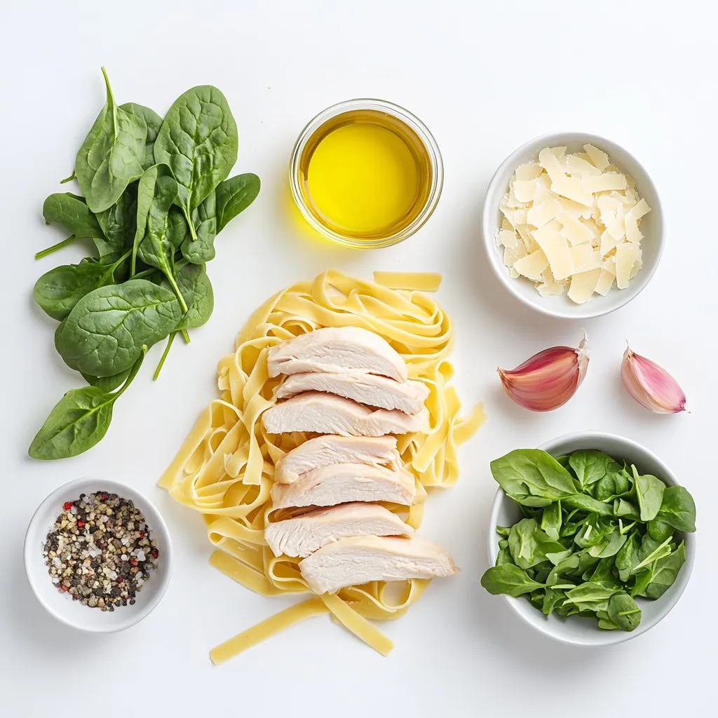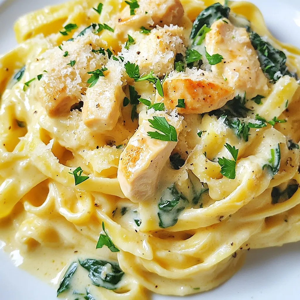 A delicious and creamy pasta dish featuring chicken, Parmesan cheese, and spinach.