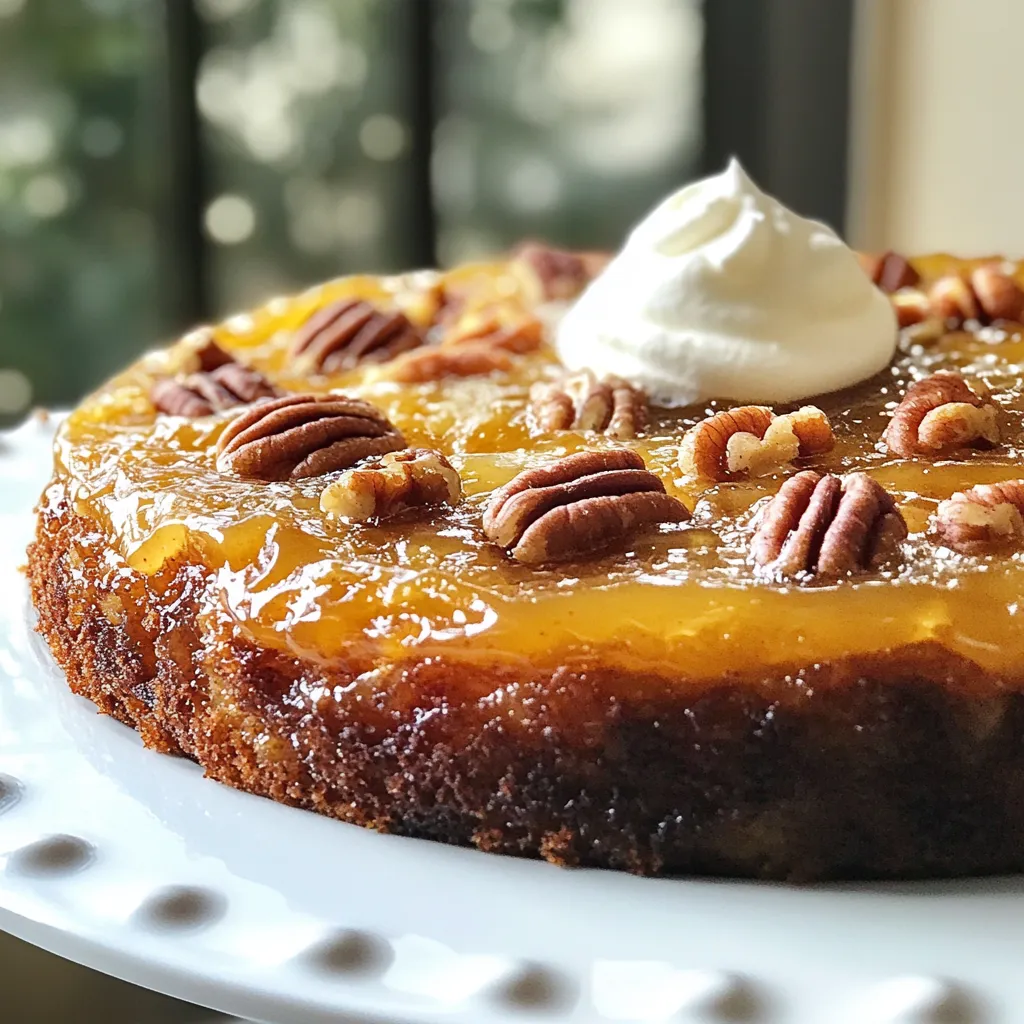 A delicious upside-down cake featuring a caramelized pecan topping.