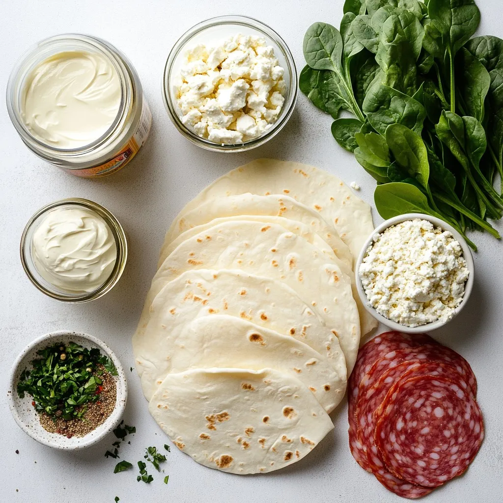 To make these salami pinwheels, you need simple ingredients. You start with cream cheese, which adds a nice, creamy texture. Dijon mustard gives a bit of tang, while garlic powder and Italian seasoning boost the flavor. Flour tortillas act as the base for our pinwheels.