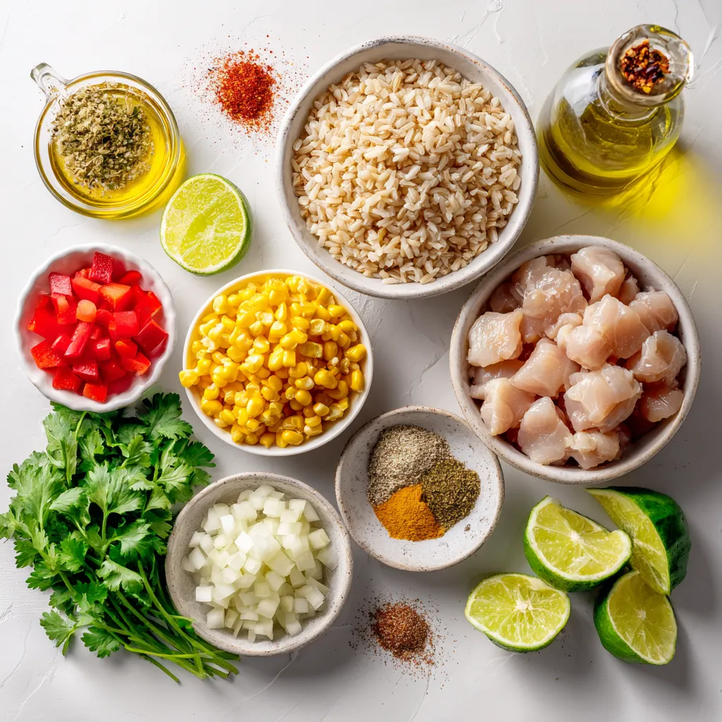 These main ingredients create a hearty base for your dish. The chicken thighs add rich flavor and tenderness. Rinsing the brown rice helps remove excess starch, leading to a better texture. Salsa verde brings a zesty kick that ties everything together.