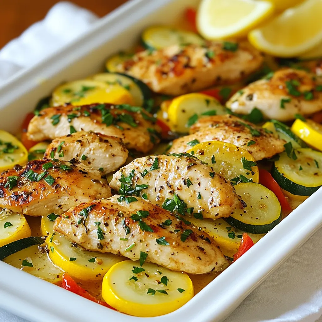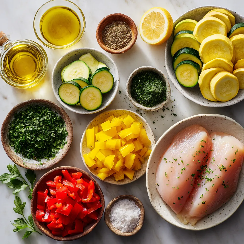 A delicious and healthy chicken dish featuring zucchini, yellow squash, and bell pepper, perfect for a family meal.