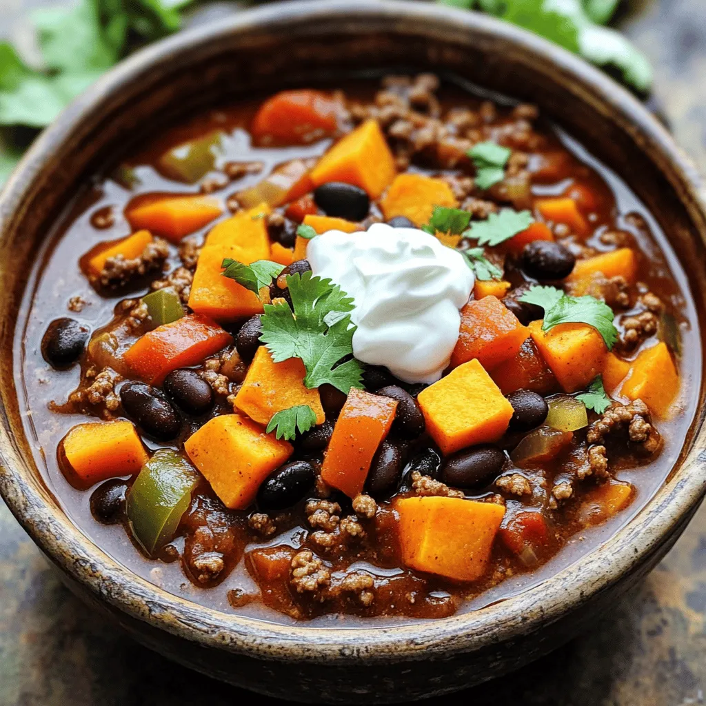 These ingredients combine to create a warm and hearty dish. Each item plays a key role. The ground beef gives a rich flavor. Sweet potatoes add a touch of sweetness. The beans and tomatoes add texture and depth. The spices bring the chili to life. You can also customize your toppings based on your taste.