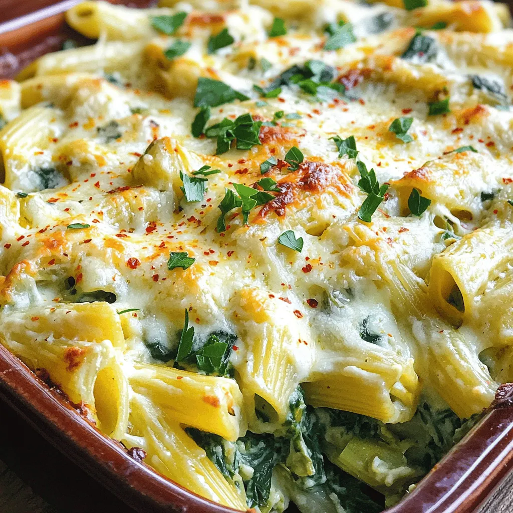 Before baking, preheat your oven to 350°F (175°C). Grease a 9×13 inch baking dish with 1 tablespoon of olive oil. Pour the pasta mixture into the dish and spread it out evenly. Top it off with the rest of the mozzarella and Parmesan cheese. Bake the dish in the oven for 25 to 30 minutes. You’ll know it’s done when the cheese is bubbly and golden brown. Remove it from the oven and let it cool for a few minutes. If you want, garnish with fresh parsley before serving. Enjoy your Spinach Artichoke Pasta Bake!