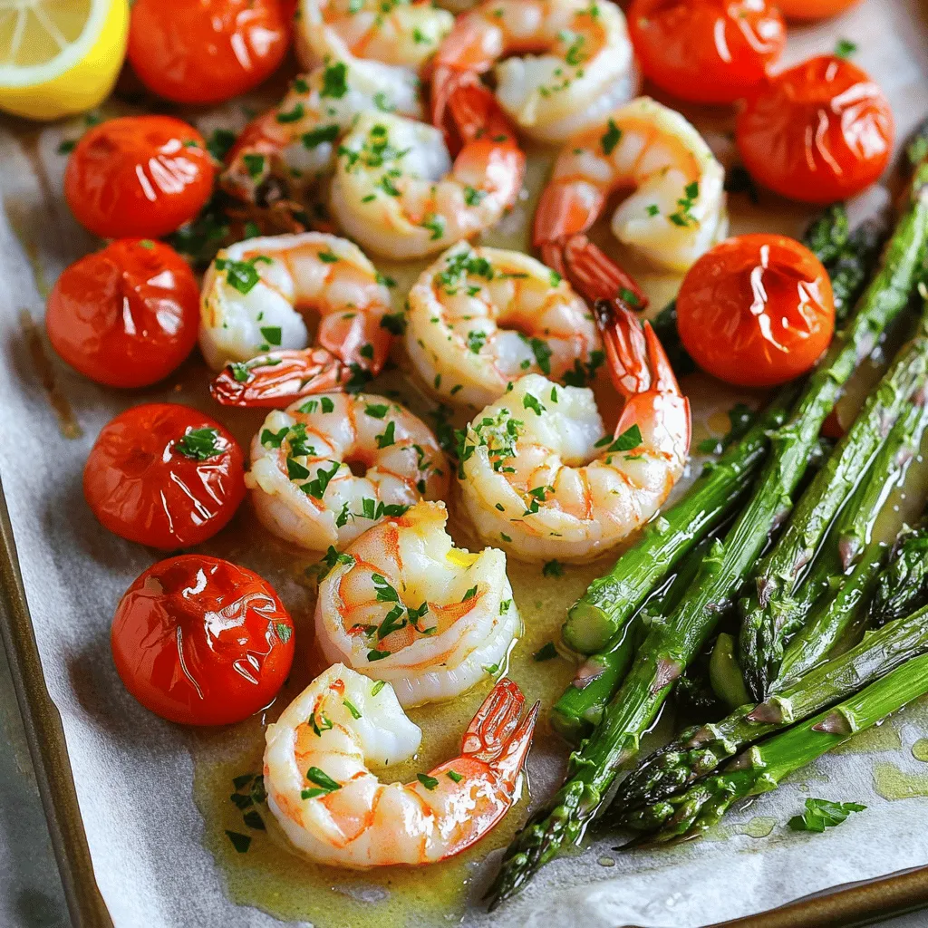 In another bowl, toss the shrimp in half of your garlic butter mixture. Make sure each shrimp is well coated. On the prepared baking sheet, spread the cherry tomatoes and asparagus evenly. Drizzle the rest of the garlic butter over them. Toss to coat the veggies in flavor.
