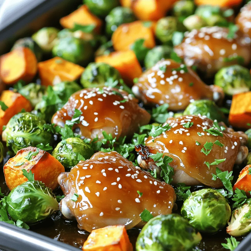 - 4 chicken thighs, boneless and skinless - 2 cups Brussels sprouts, halved - 1 large sweet potato, diced These main ingredients create a great balance of protein and veggies. Chicken thighs are juicy and flavorful, perfect for this dish. Brussels sprouts add a nice crunch and slight bitterness. The sweet potato brings a sweet element that pairs well with the sauce. - 1/4 cup honey - 3 cloves garlic, minced - 2 tablespoons soy sauce (low-sodium) The sauce will coat everything nicely. Honey adds sweetness and helps caramelize the chicken. Garlic gives a strong flavor punch. Soy sauce adds depth and saltiness without being too overpowering. - 1 tablespoon olive oil - 1 teaspoon ground ginger - Sesame seeds for garnish - Fresh parsley, chopped for garnish Olive oil helps the chicken and veggies brown well. Ground ginger adds a warm spice that brightens the dish. After baking, sesame seeds and parsley finish it off with a touch of crunch and color. 1. Preheating the oven First, you need to preheat your oven to 425°F (220°C). This step is key for achieving crispy chicken and tender veggies. 2. Whisking the sauce In a bowl, combine 1/4 cup honey, 3 minced garlic cloves, 2 tablespoons low-sodium soy sauce, 1 tablespoon olive oil, and 1 teaspoon ground ginger. Mix well until everything blends into a smooth sauce. 1. Coating the chicken and vegetables In a large bowl, add 4 boneless, skinless chicken thighs, 2 cups halved Brussels sprouts, and 1 diced sweet potato. Pour the honey garlic sauce over them. Toss until all the chicken and vegetables get a nice coating. 2. Preparing the sheet pan Line a baking sheet with parchment paper or foil. This helps with cleanup later. Spread the coated chicken and veggies in a single layer on the sheet pan. Make sure they have space to roast well. 1. Baking time and checking doneness Place the sheet pan in your preheated oven. Bake for 25 to 30 minutes. The chicken should reach an internal temperature of 165°F (74°C). Your veggies should be tender and slightly caramelized. 2. Resting before serving Once done, take the sheet pan out of the oven. Let it rest for about 5 minutes. This resting time helps the juices settle in the chicken. Before serving, sprinkle sesame seeds and chopped fresh parsley on top for a nice touch. To get your chicken nicely caramelized, use high heat. Baking at 425°F (220°C) works well. Make sure the chicken and veggies are in a single layer. This helps them cook evenly and turn golden. The sweet potato brings natural sweetness, which helps with caramelization too. To keep your chicken juicy, don’t overcook it. Use a meat thermometer to check the internal temperature. When it reaches 165°F (74°C), it's done. Let the chicken rest for five minutes after baking. This helps the juices settle back into the meat. For plating, you can serve directly from the sheet pan. This gives a rustic look. If you want to impress, plate each piece separately. Drizzle some leftover sauce on top for extra flavor. Garnish with sesame seeds and fresh parsley. This brightens up the dish and adds a nice crunch. If you want to switch up the veggies, try using green beans or carrots. They both work great in this recipe. You can also replace chicken thighs with chicken breasts. Just remember that breasts may cook faster, so check them earlier. This way, you can still enjoy a tasty meal no matter what you have on hand. {{image_2}} You can change the flavors in your sheet-pan honey garlic chicken and sprouts. A few simple tweaks can make a big difference. - Added spices and herbs: Try adding a pinch of smoked paprika for warmth. A dash of cayenne pepper gives it a kick. Fresh herbs like thyme or rosemary can add fresh notes. - Using different sweeteners: You can swap honey for maple syrup or agave nectar. Each sweetener brings a unique flavor. This way, you can adjust sweetness to your liking. Making this dish fit your diet is easy. You can modify it to suit your needs. - Making it gluten-free: Use gluten-free soy sauce instead of regular soy sauce. This keeps the dish tasty while avoiding gluten. - Adding more vegetables for a hearty dish: Consider adding bell peppers, carrots, or zucchini. They not only add color but also boost nutrition. More veggies make the meal filling and flavorful. To store leftovers, first, let your dish cool. This helps keep it fresh. Place the chicken and sprouts in an airtight container. Make sure to seal it well to prevent air from getting in. You can store it in the fridge for up to three days. For best results, use glass or BPA-free plastic containers. These materials help keep flavors intact and are easy to clean. If you have extra sauce, keep it in a small jar. This adds extra flavor when you reheat the meal. You can freeze this dish if you want to save it for later. First, let it cool completely. Then, transfer the leftovers into freezer-safe bags or containers. Be sure to remove as much air as possible. This helps prevent freezer burn. You can freeze it for up to three months. When you're ready to eat, thaw it in the fridge overnight. You can reheat it in the oven at 350°F (175°C) for about 20 minutes. If you prefer, you can use the microwave as well. Just make sure it’s heated all the way through. Enjoy your delicious meal again! How long to bake chicken thighs? You should bake chicken thighs for about 25 to 30 minutes at 425°F (220°C). This temperature helps to get a nice crisp on the outside while keeping the inside juicy. What to do if chicken is not cooked through? If the chicken is not cooked through, return it to the oven. Use a meat thermometer to check for an internal temperature of 165°F (74°C). You can bake it for an additional 5 to 10 minutes, checking often. Can I use frozen Brussels sprouts? Yes, you can use frozen Brussels sprouts. Just remember to thaw and drain them first. This will help them cook evenly and avoid excess moisture in the dish. Can I make this dish ahead of time? You can prepare this