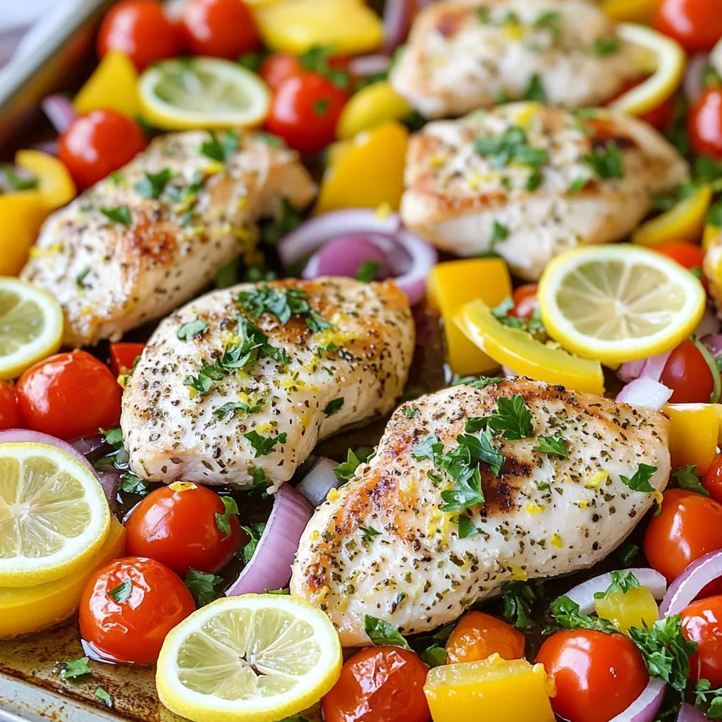 While the chicken marinates, prepare your vegetables. In another bowl, toss cherry tomatoes, bell pepper slices, and red onion with olive oil, salt, and pepper. On a large sheet pan, place the marinated chicken in the center. Lay lemon slices around the chicken. Spread the vegetable mix evenly around the chicken.